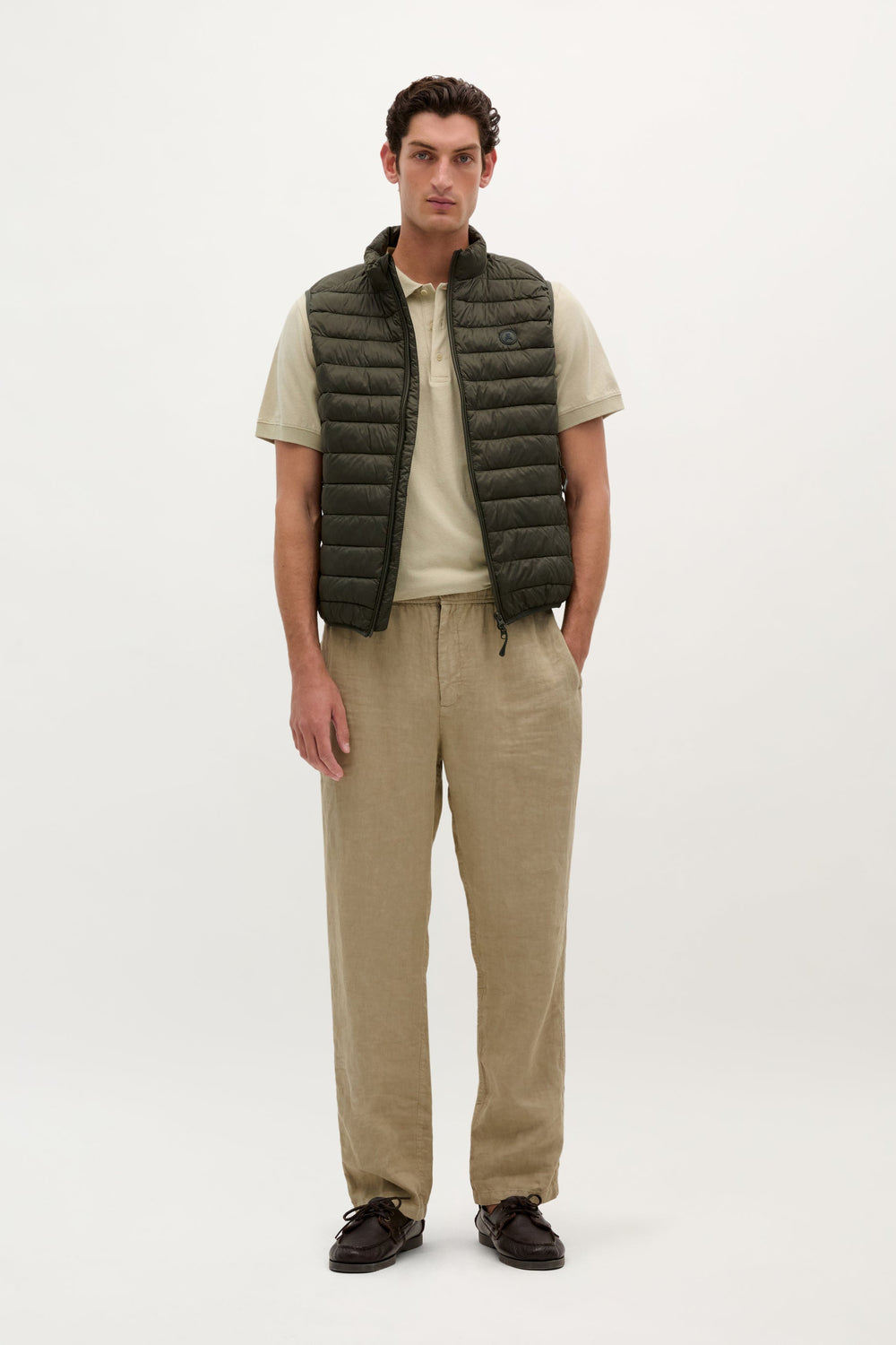 - Zonder mouwen, met elastische armsgaten.