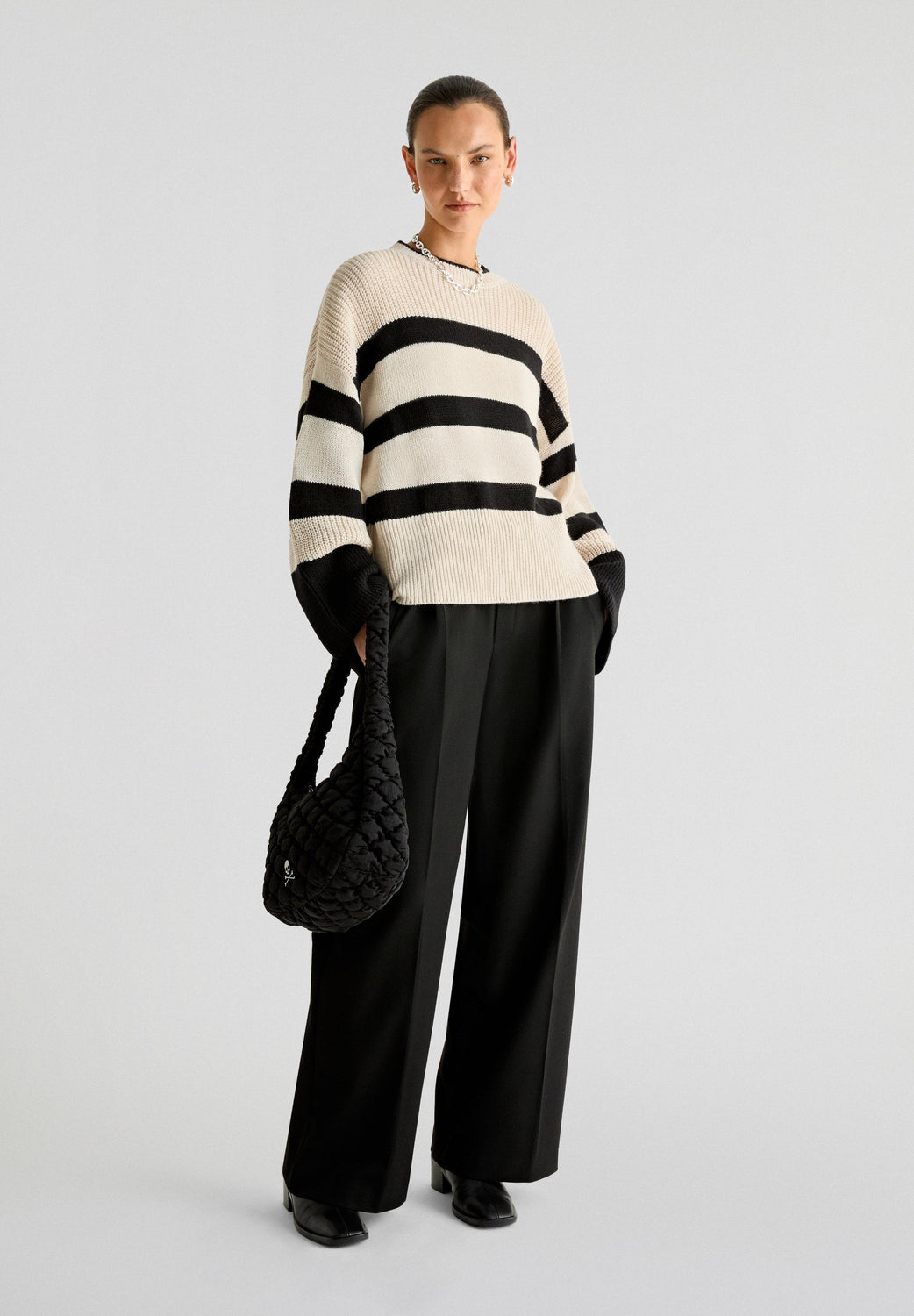 Sweater made of a wool blend, with stripes. Regular fit, round neck and flared long sleeves.