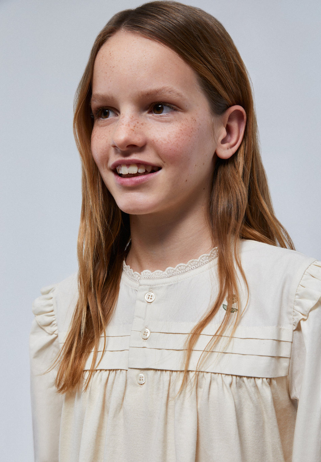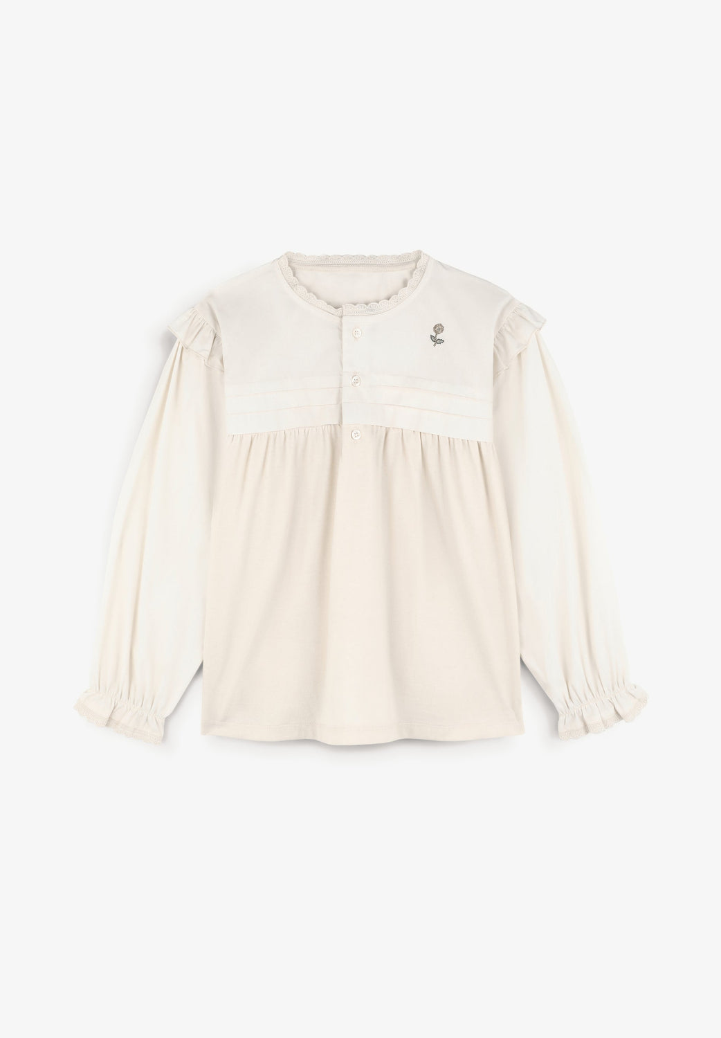 - Overhemd: ronde hals met knoopsluiting voor. Lange mouw met manchet en volant. Volant op de schouder. Afgewerkt met geborduurde strook. Geborduurde bloem op de borst