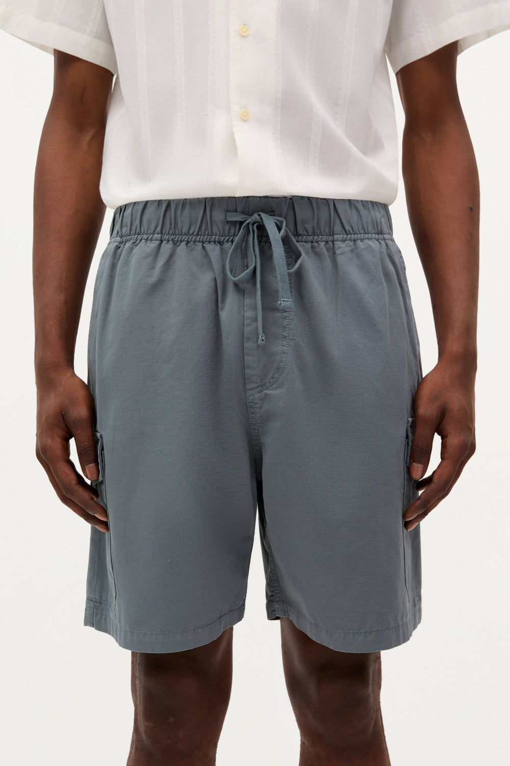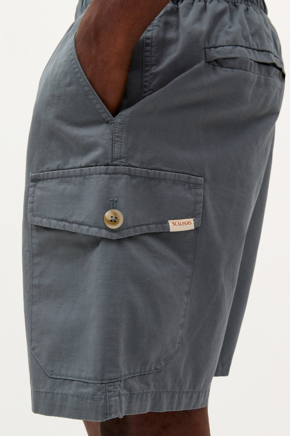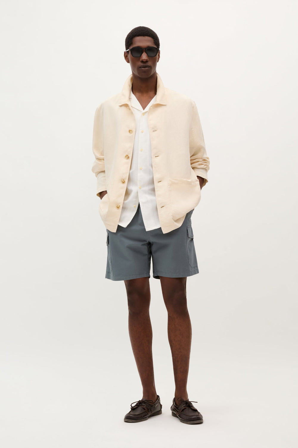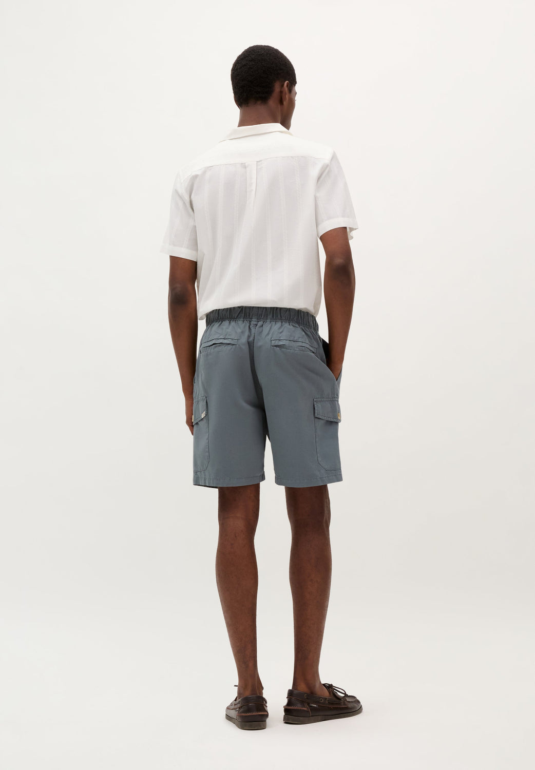 Bermuda shorts made of linen. Cargo. Side pockets with button fastenings. Back pockets. Adjustable elasticated waistband with a front knot.