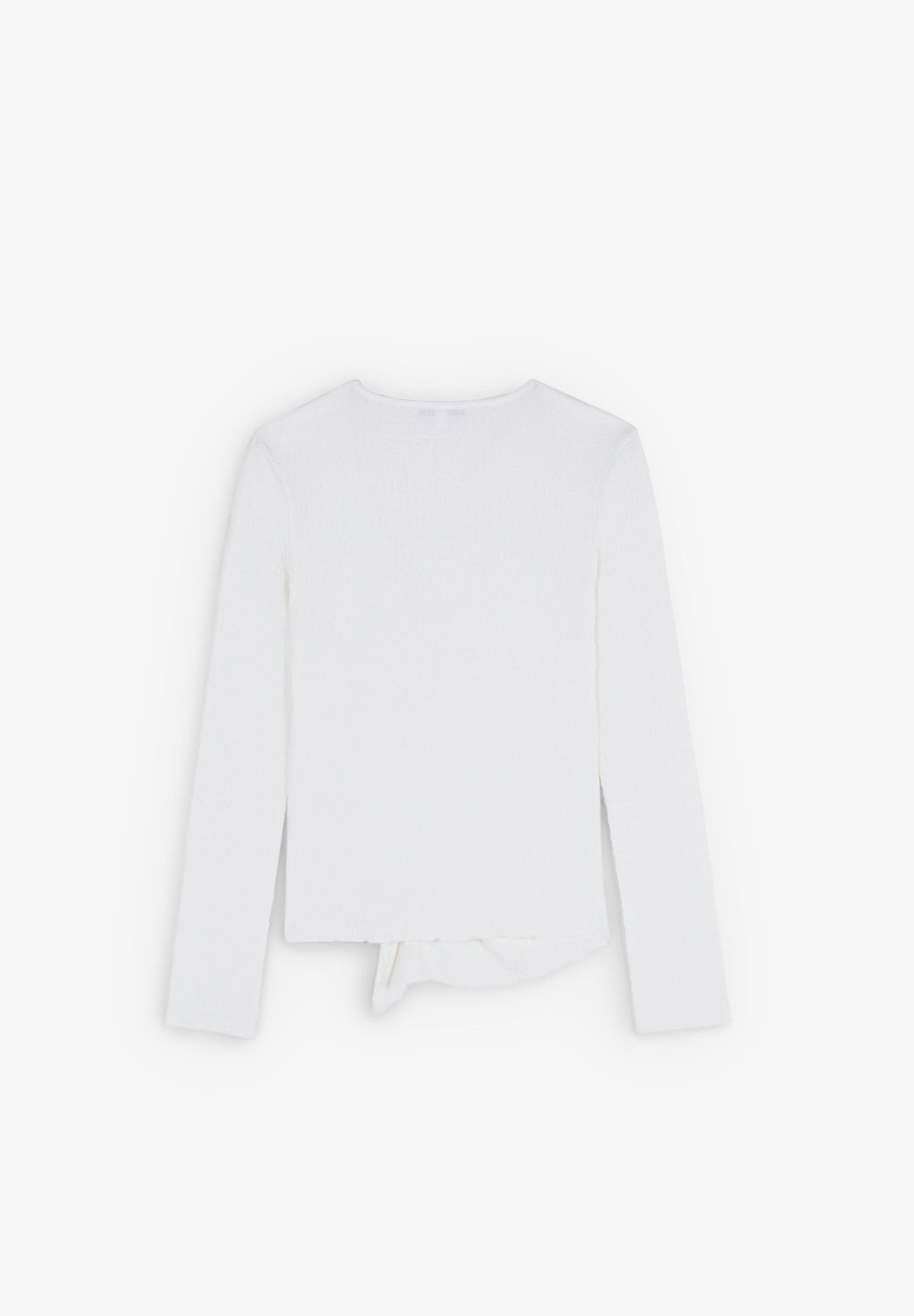 Top met structuur, asymmetrische V-hals met ruches en lange mouwen.