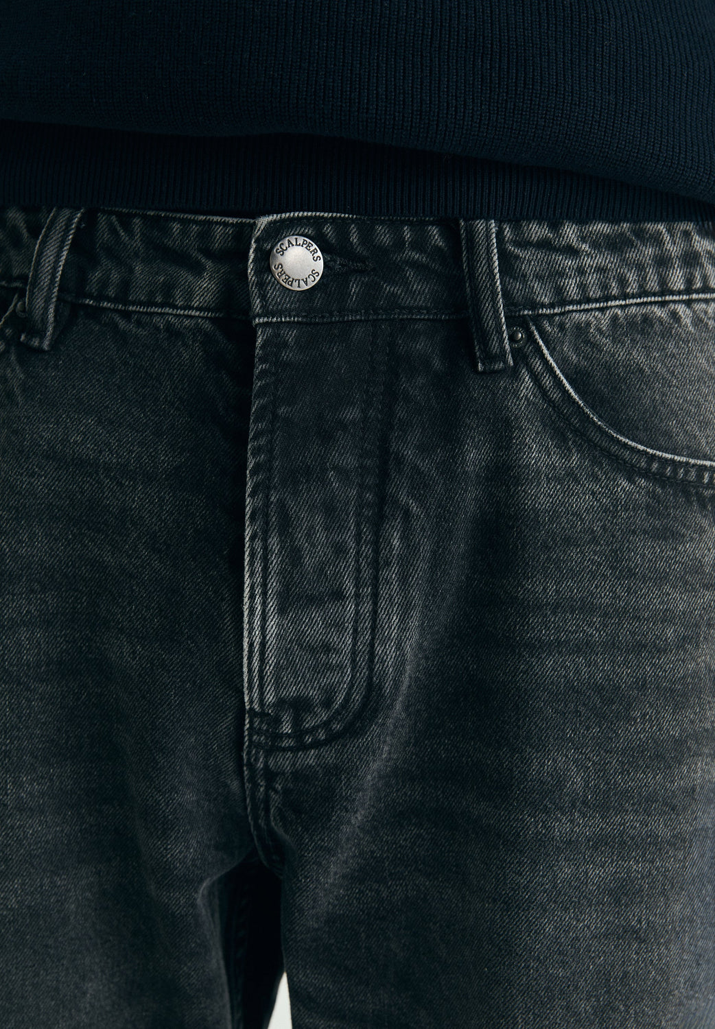 Cropped fit jeans. Five pockets. Faded effect. Belt loops at the waist. Front zip and button fastening.