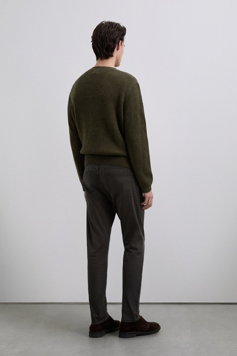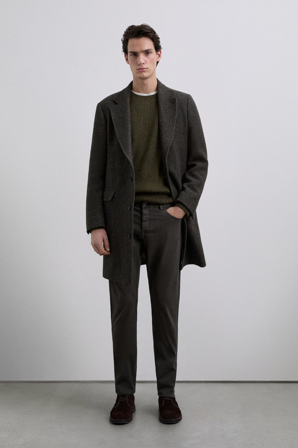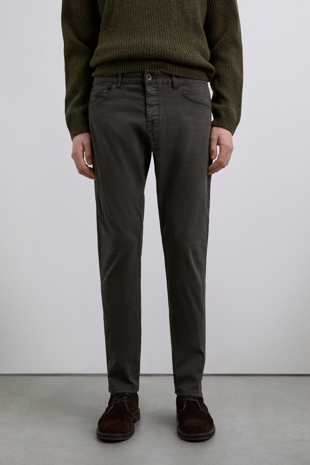Trousers made of a cotton blend. Slightly stretchy. Button fastening. Regular fit. Back and side pockets. Belt loops.