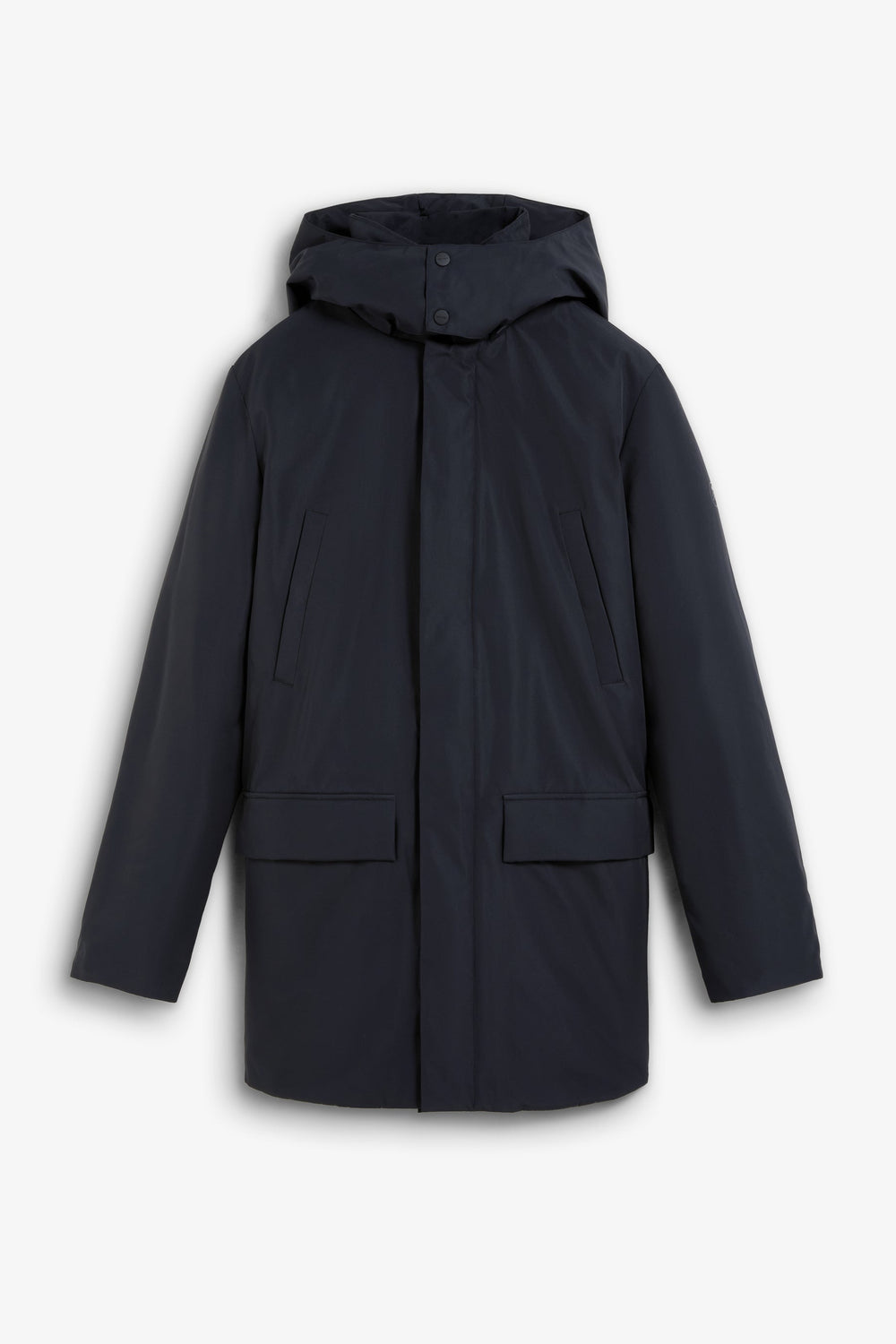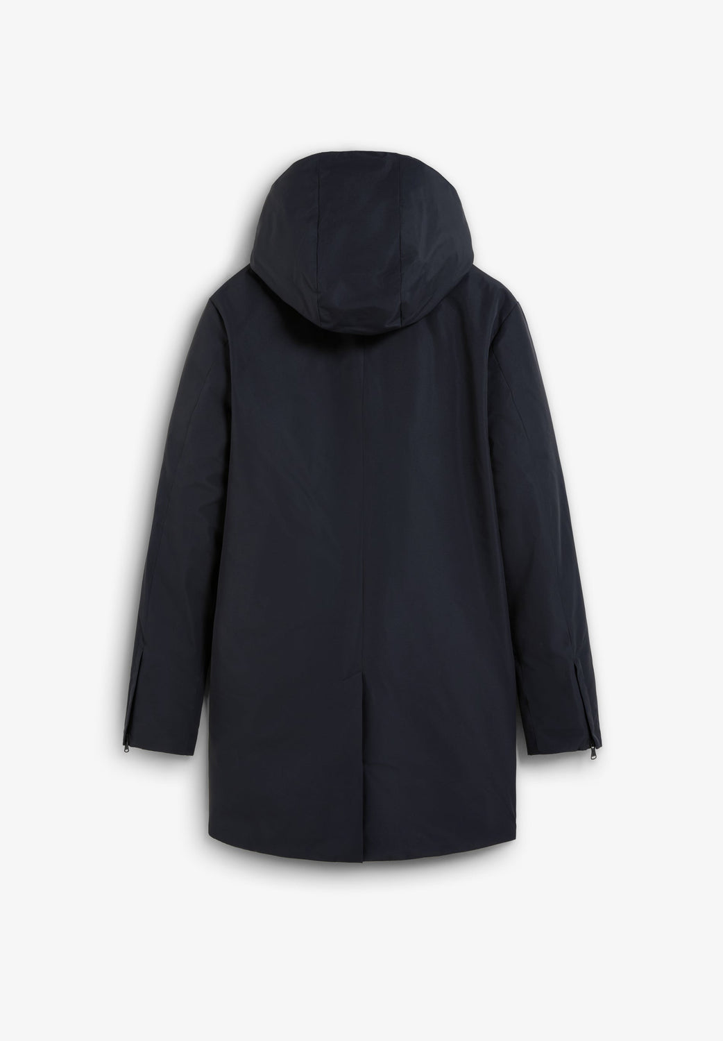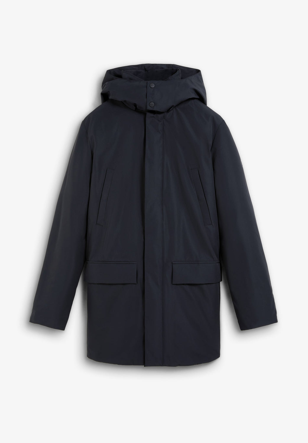 Hooded technical parka. Long sleeves. Four front pockets, two slanted top pockets and two lower flap pockets. Adjustable zip fastening on the cuffs.