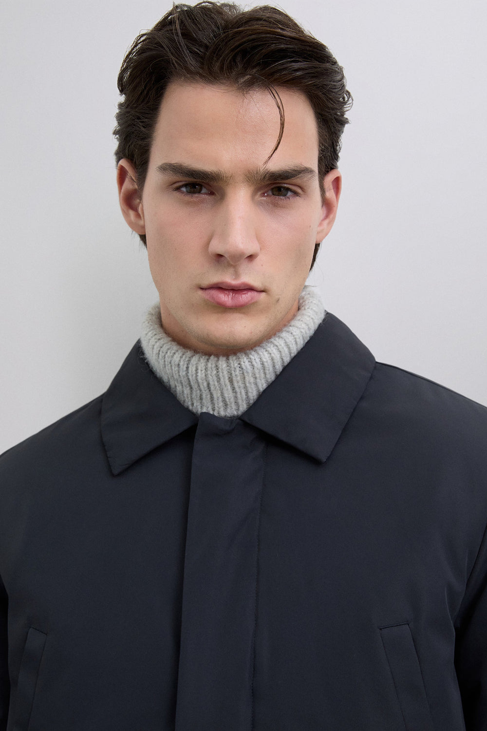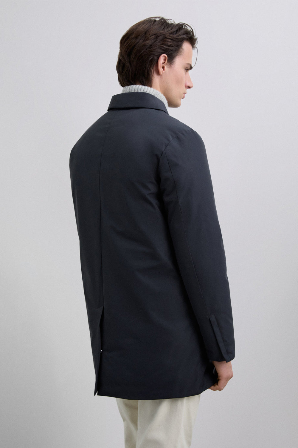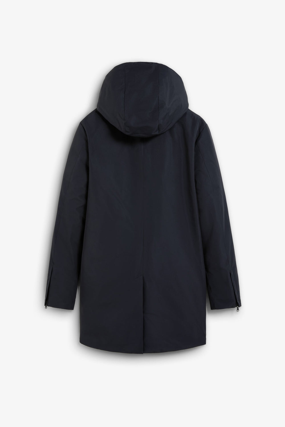 Hooded technical parka. Long sleeves. Four front pockets, two slanted top pockets and two lower flap pockets. Adjustable zip fastening on the cuffs.
