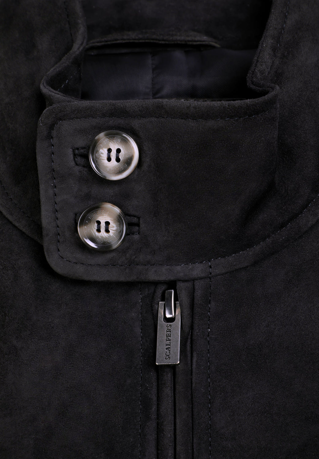100% goatskin jacket. Fitted. Two-way zip. Ribbed collar, cuffs and waistband. Two front pockets with button fastening. Two button fastening collar.