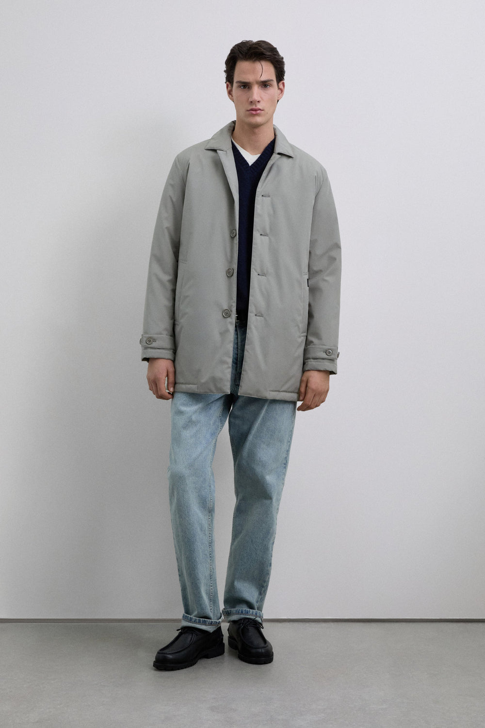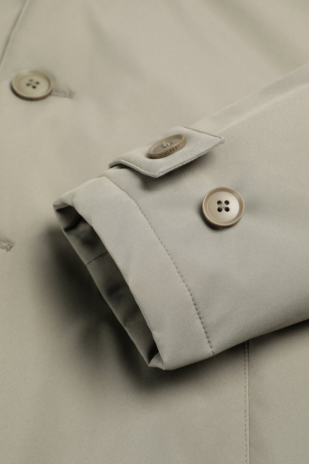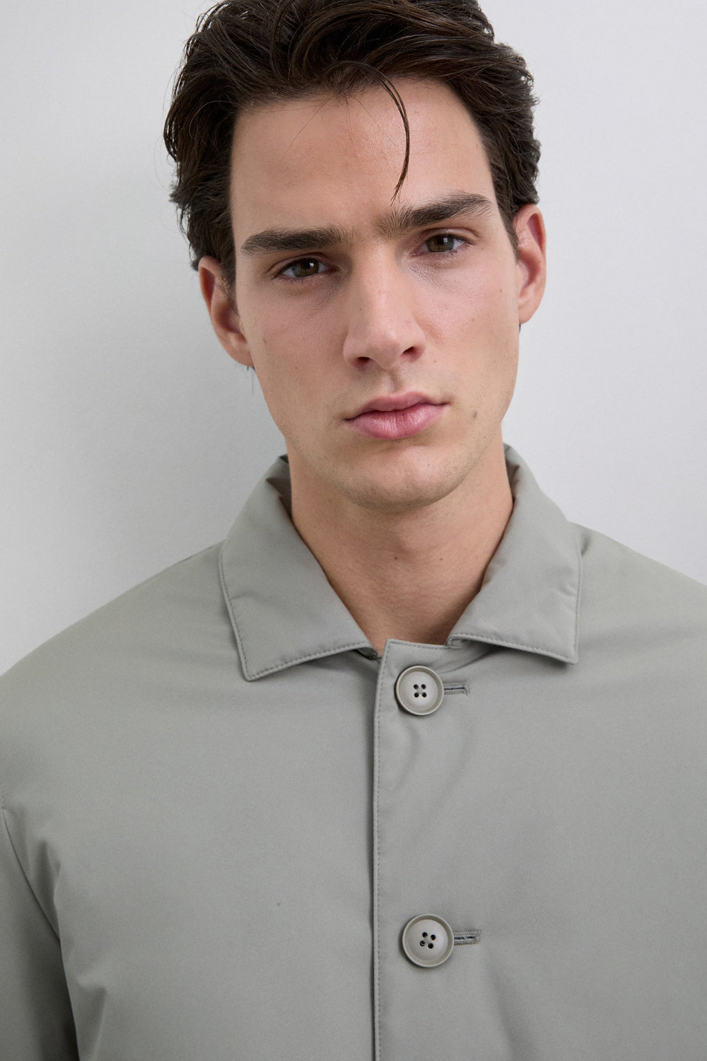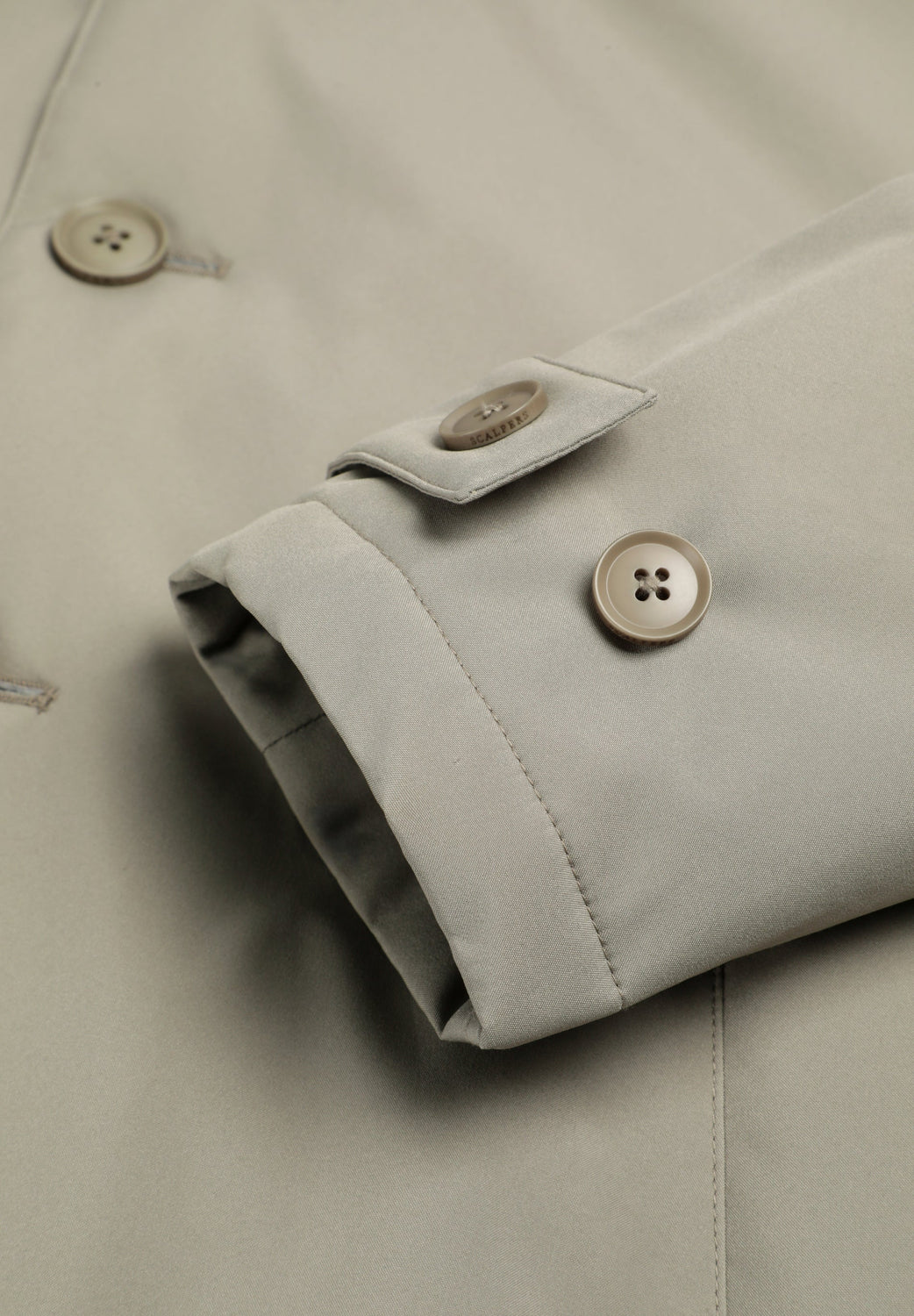 Trench coat in water-repellent and windproof fabric. Long sleeves with snap-button tabs on cuffs. Front button fastening. Side pockets. Engraved logo detail on the buttons.