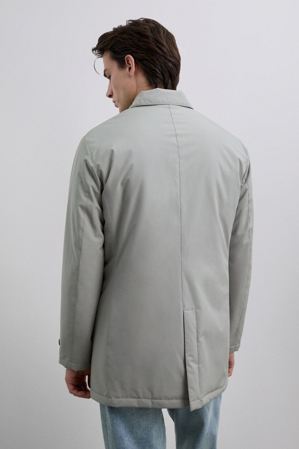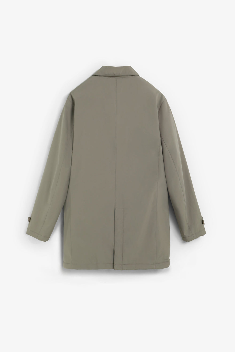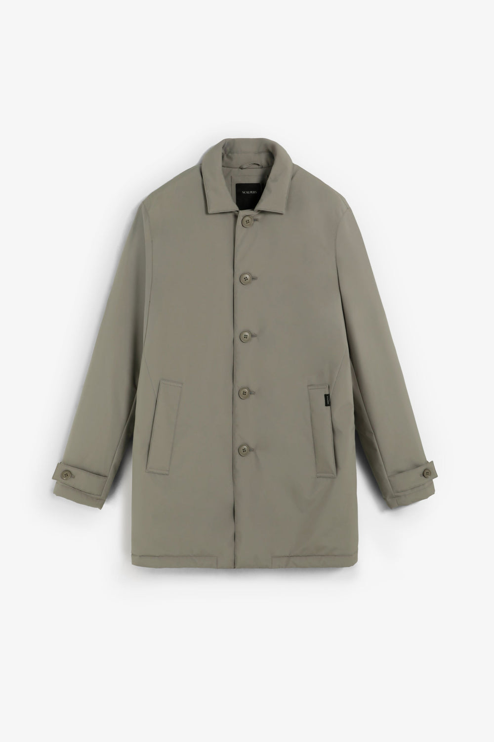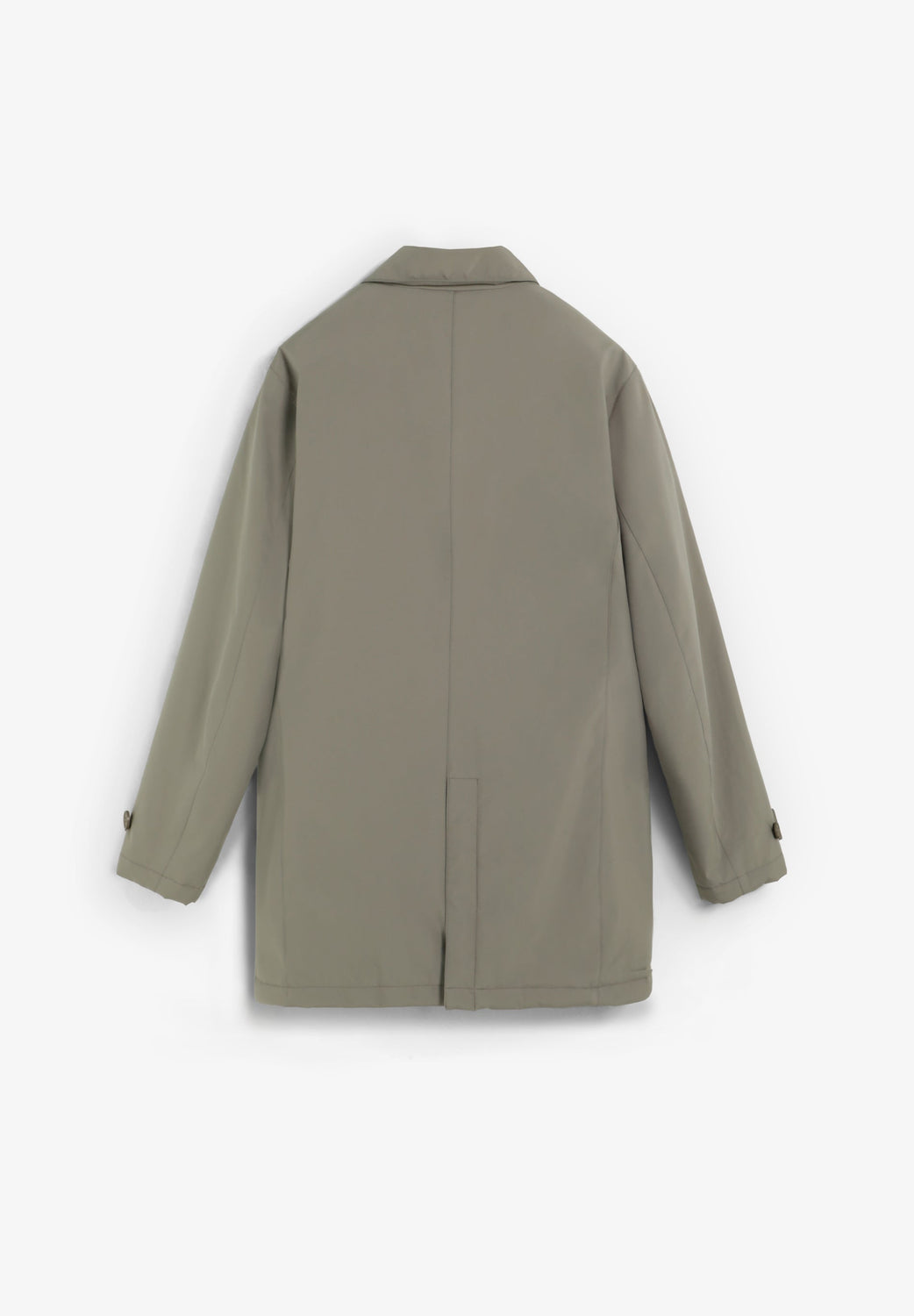 Trench coat in water-repellent and windproof fabric. Long sleeves with snap-button tabs on cuffs. Front button fastening. Side pockets. Engraved logo detail on the buttons.