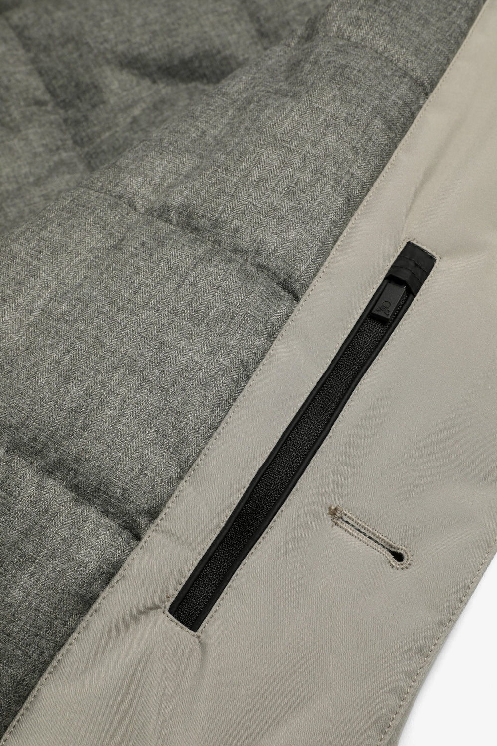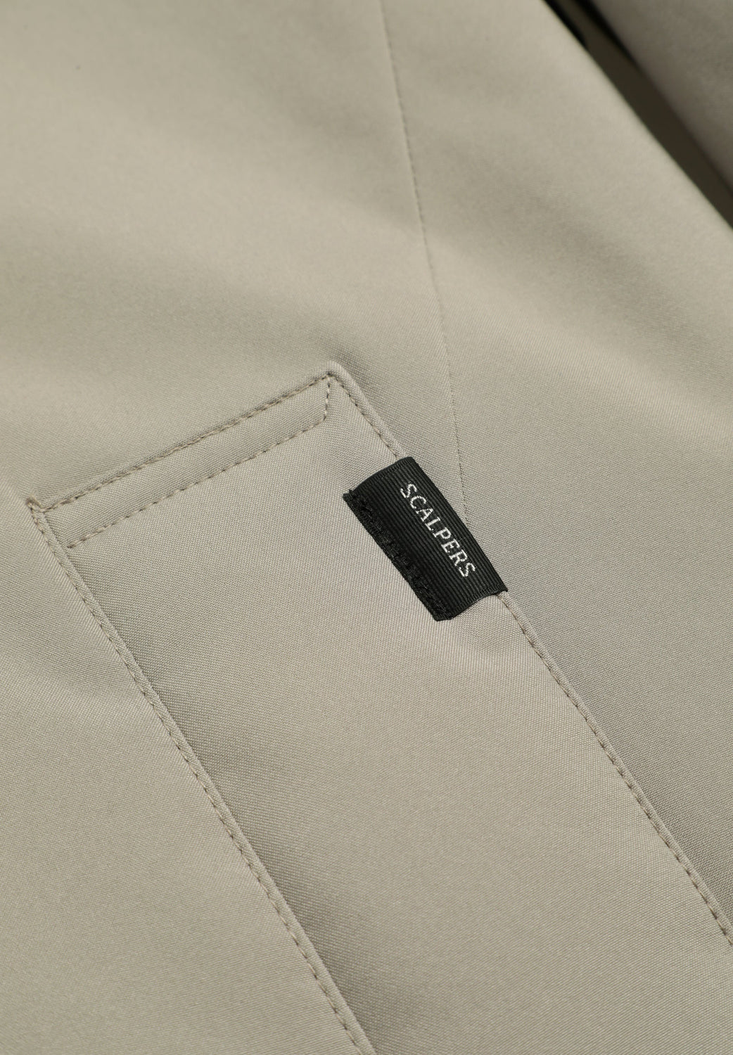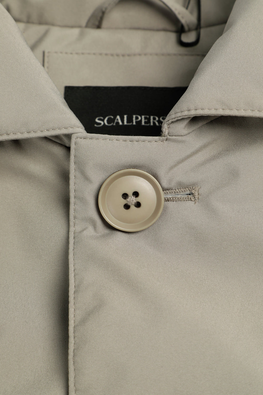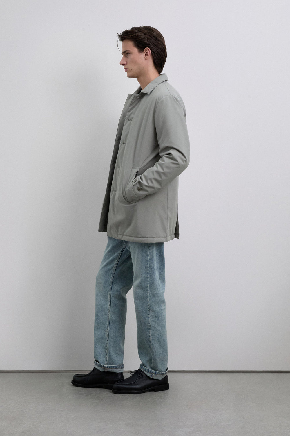 Trench coat in water-repellent and windproof fabric. Long sleeves with snap-button tabs on cuffs. Front button fastening. Side pockets. Engraved logo detail on the buttons.