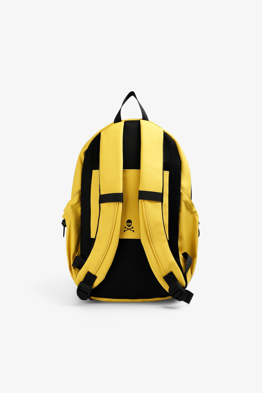Backpack made of a technical fabric. Double exterior front pocket. Adjustable buckle fastening. Skull detail on front and back print. Top handle. Side and back fastening adjustments. Padded reinforced back.