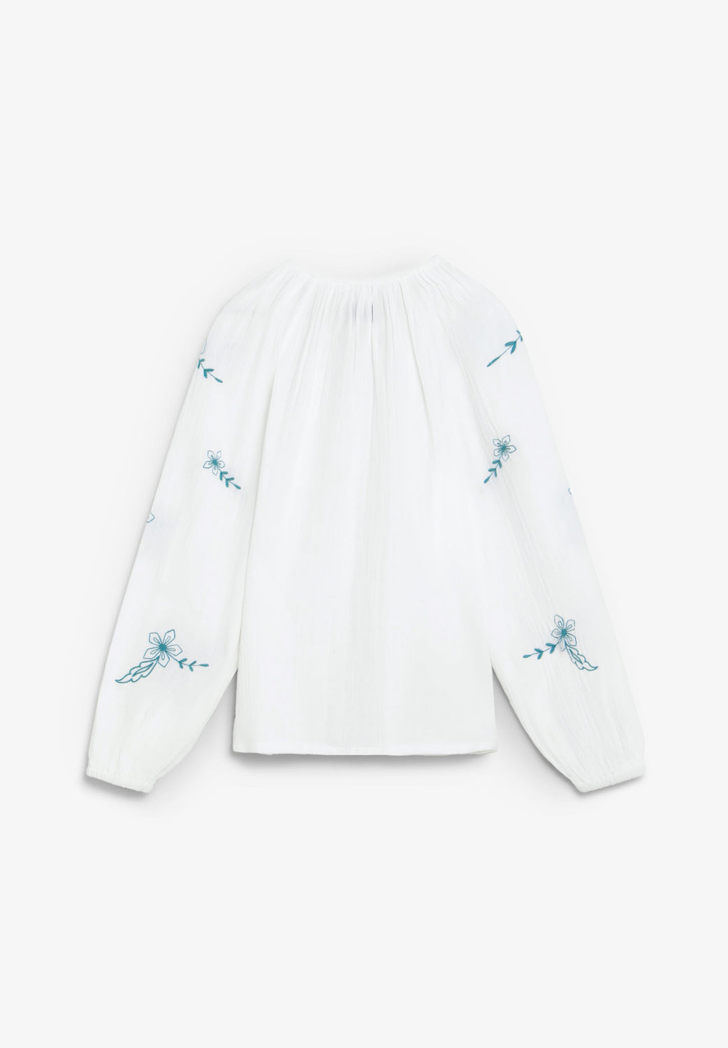 Blouse made of 100% BCI cotton. V-neck and long sleeves with elastic cuffs. Embroidered floral details on sleeves and front.