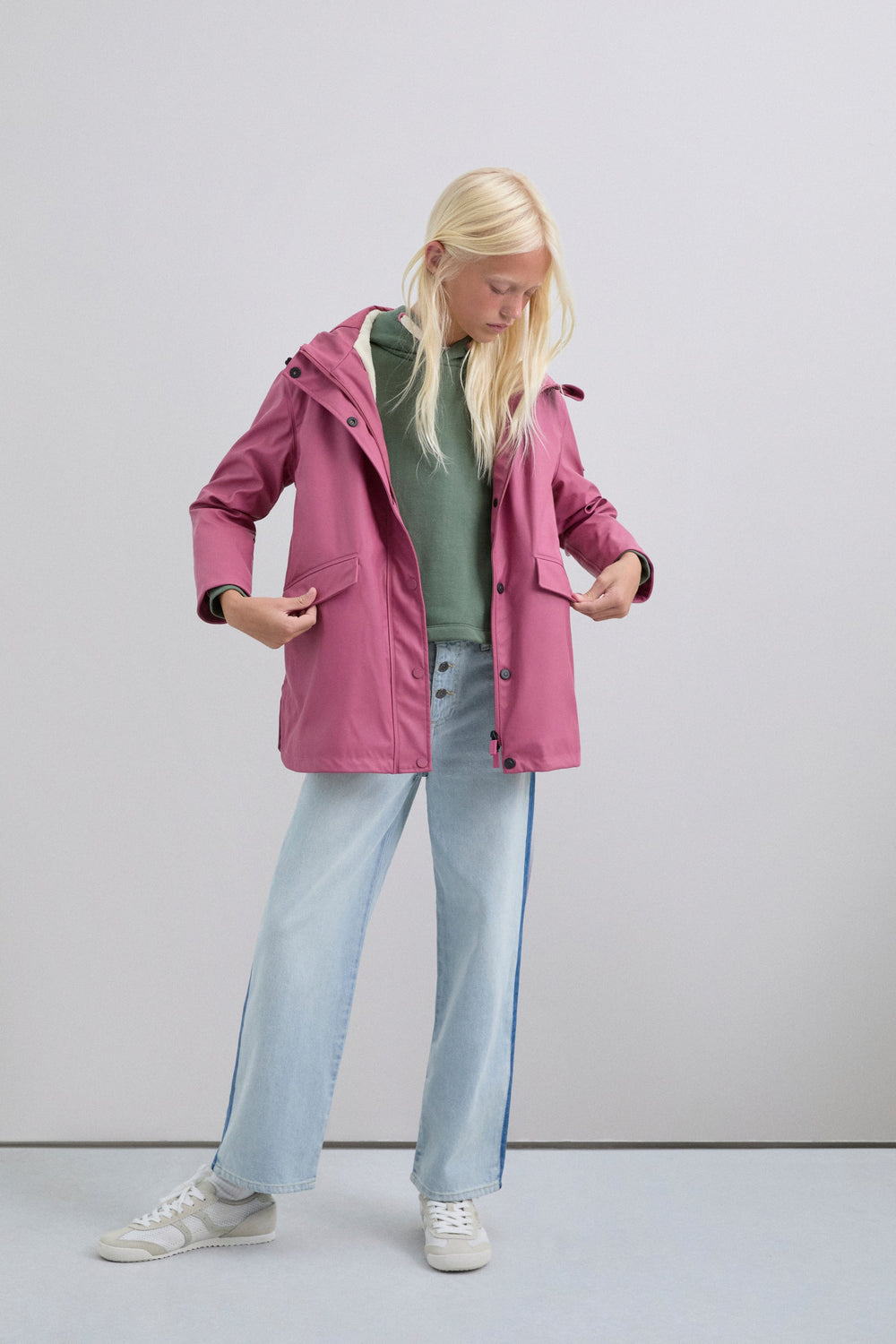 Waterproof jacket. Long sleeves. Adjustable drawstring hood. Two front pockets. Rubberised skull and logo patch detail on sleeve. Button and zip fastening.