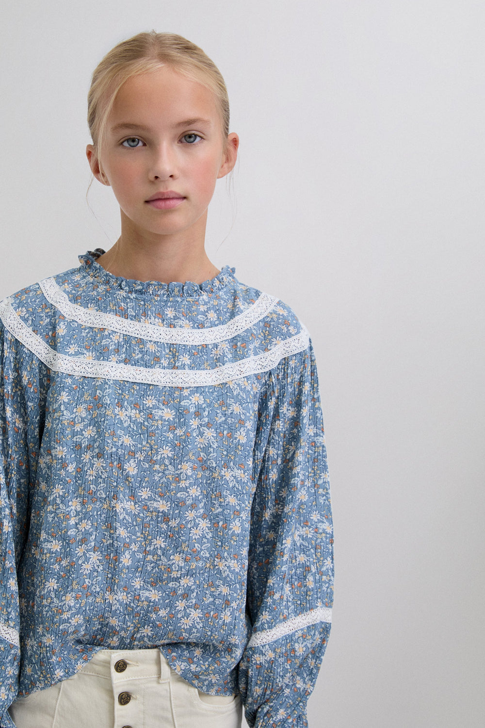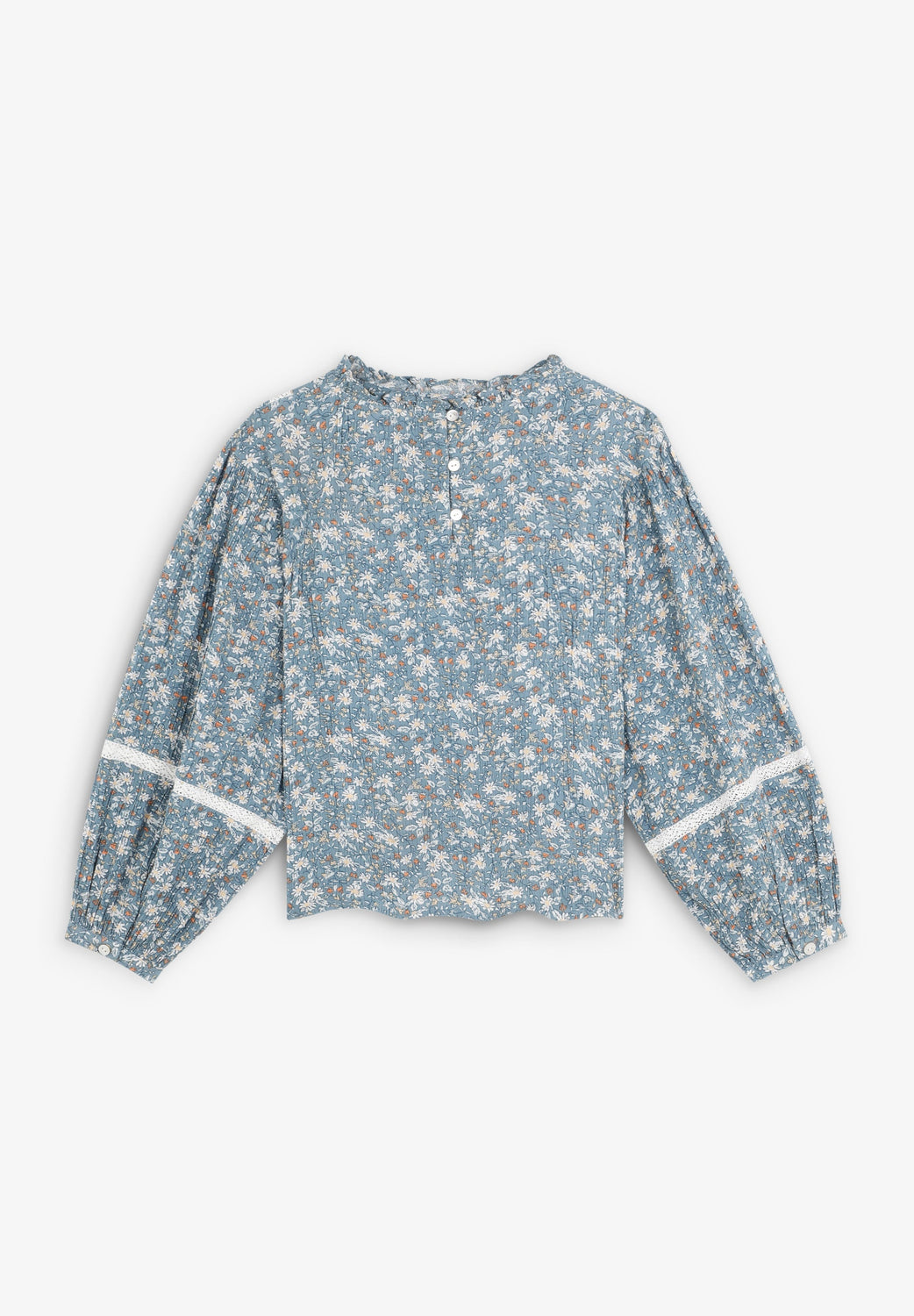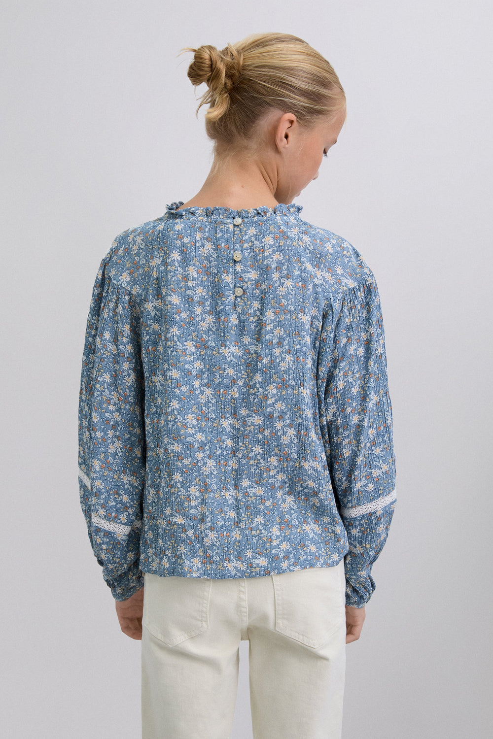 Blouse. Regular fit. Round neck. Long puffed sleeves with button fastening. Embroidered details on collar and sleeves. Back button fastening. Floral print. Ruffles on the hem.