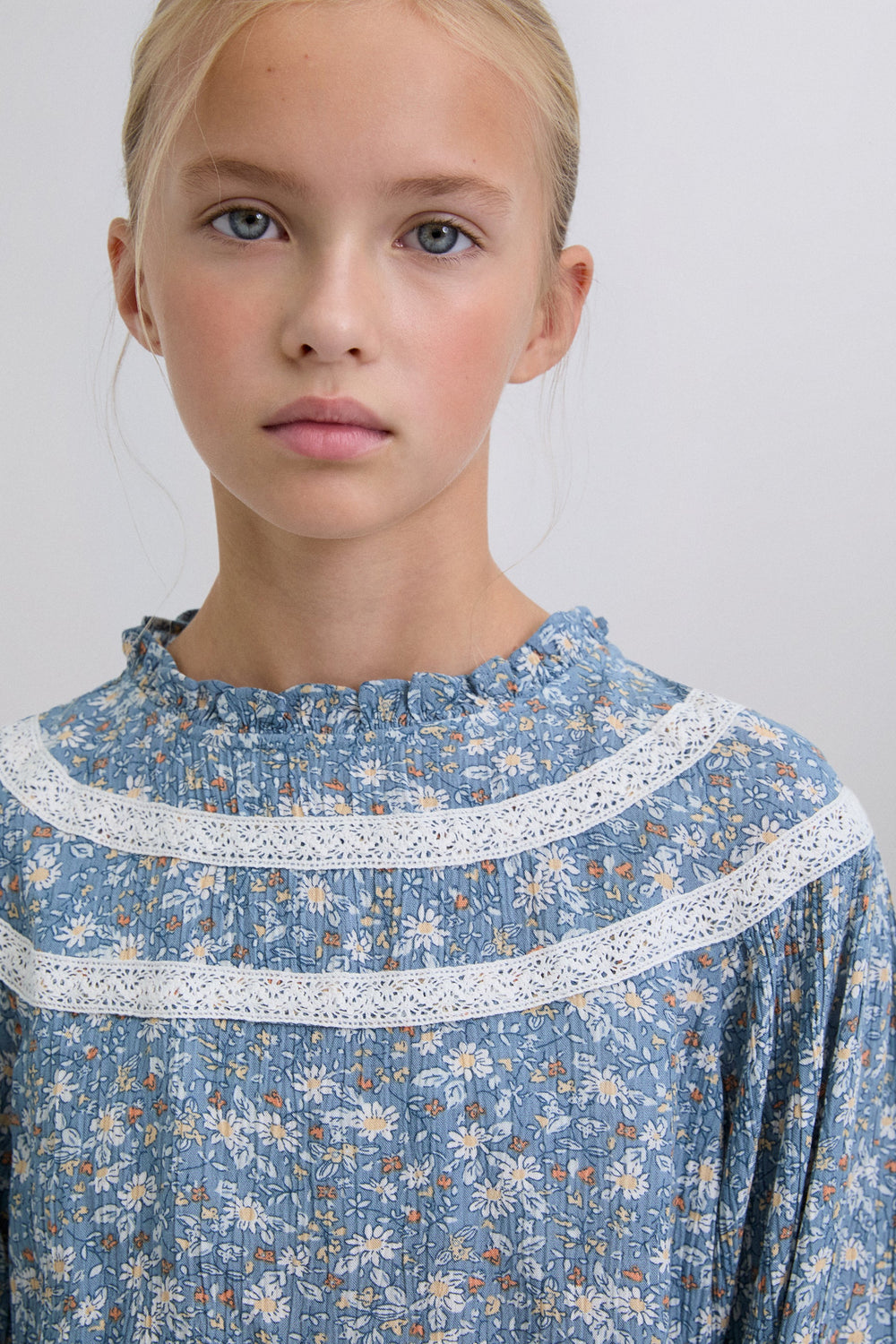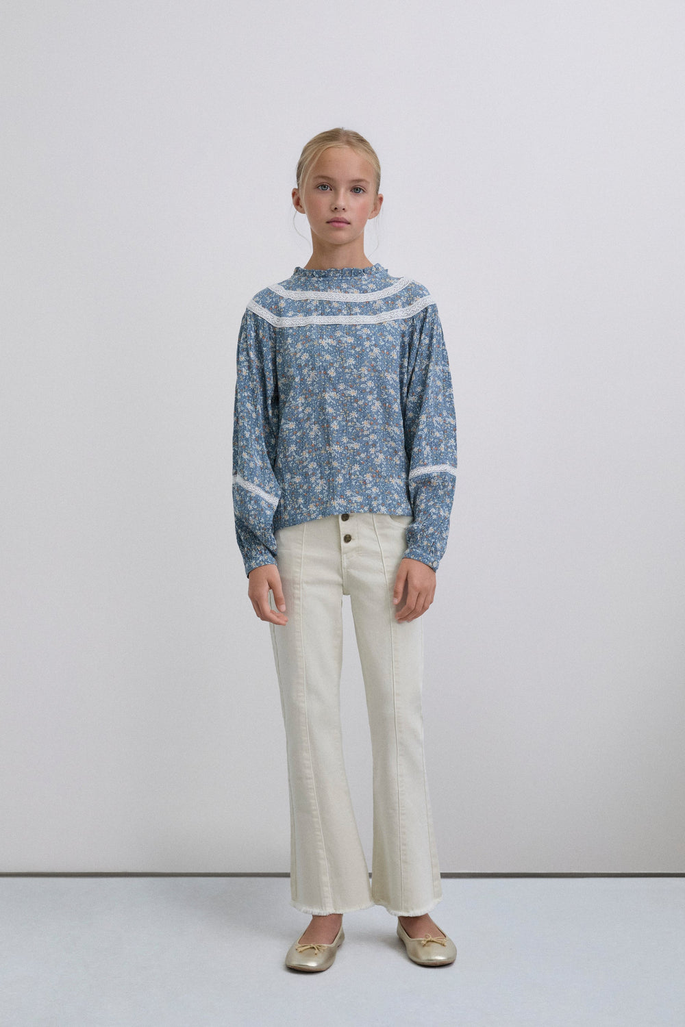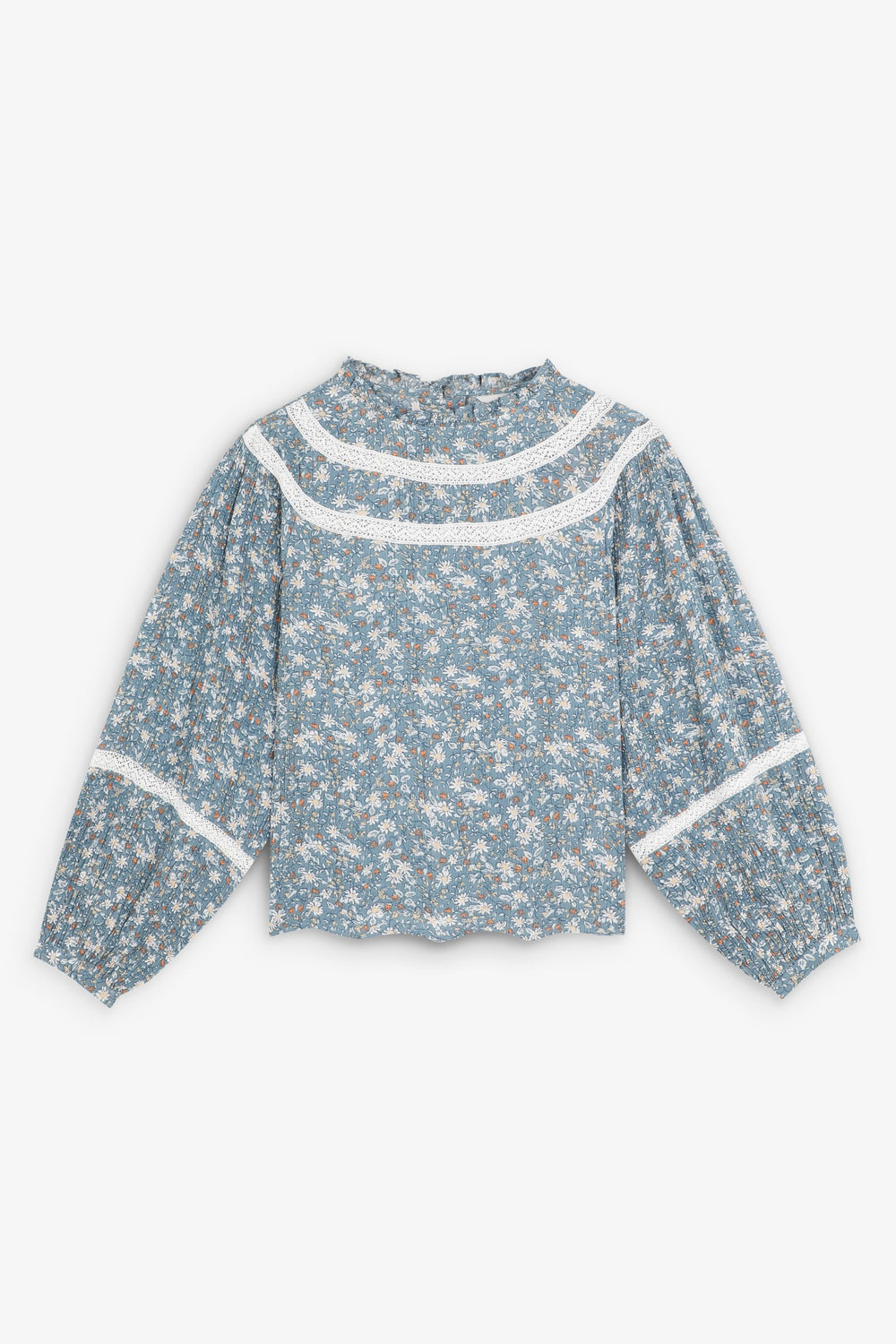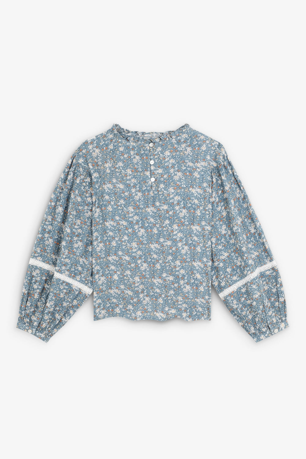 Blouse. Regular fit. Round neck. Long puffed sleeves with button fastening. Embroidered details on collar and sleeves. Back button fastening. Floral print. Ruffles on the hem.