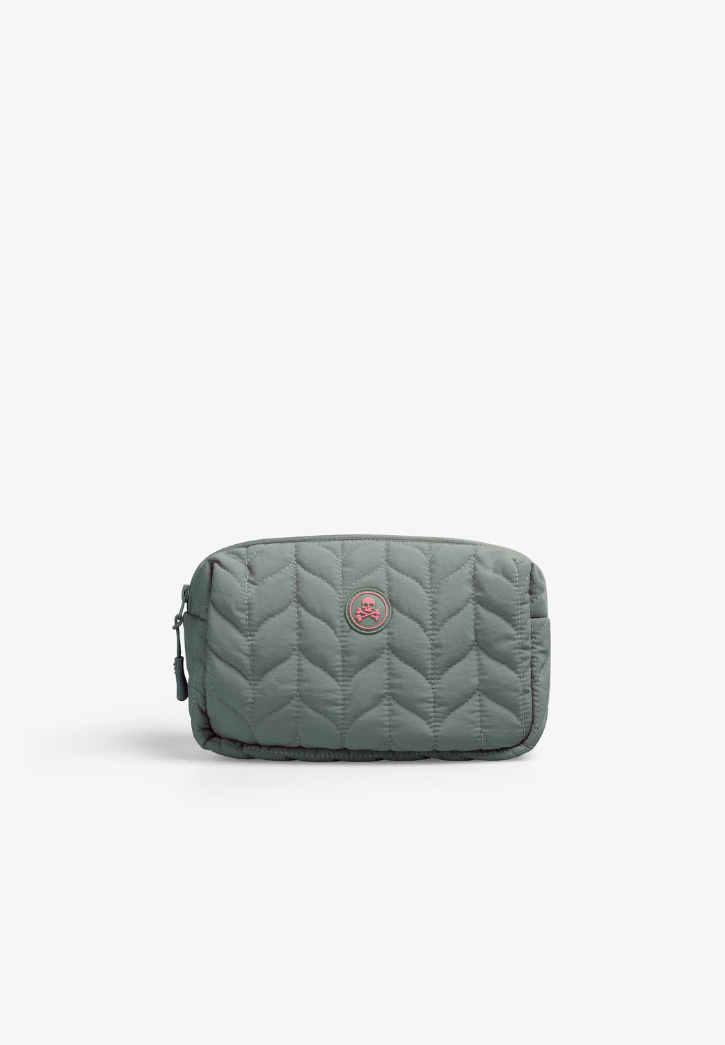 Synthetic toiletry bag. Front rubberised skull patch detail. Zip fastening.
