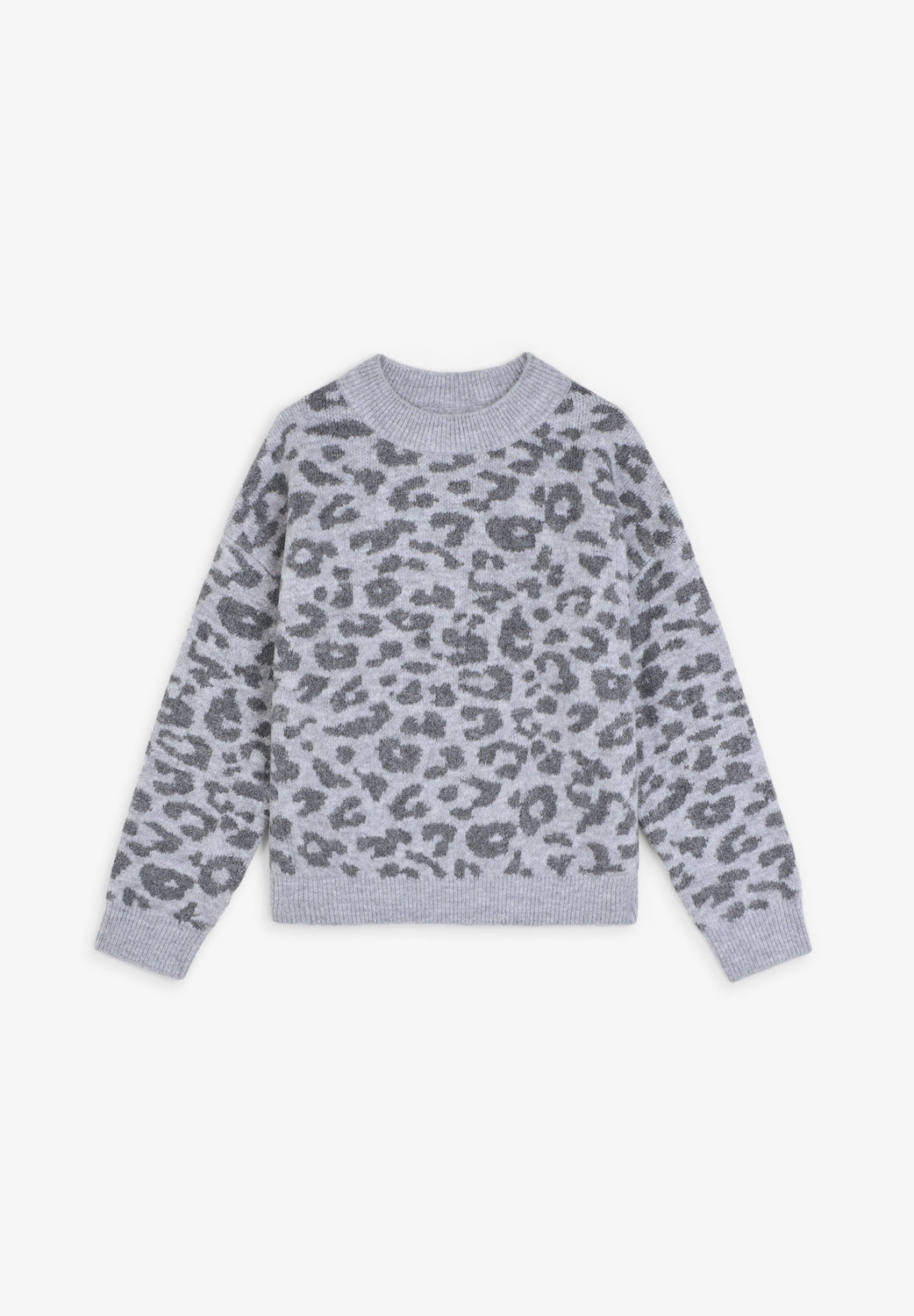Knit sweater. Long sleeves. Round neck. Animal print. Contrast ribbed finish.