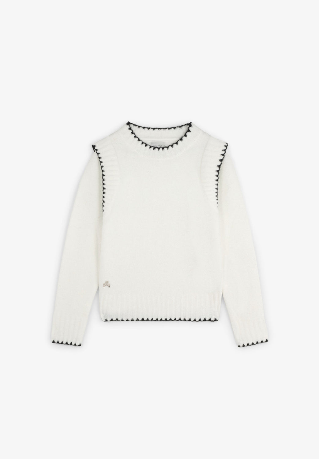 Knit sweater. Round neck. Long sleeves. Contrast embroidered skull detail. Ribbed trim.