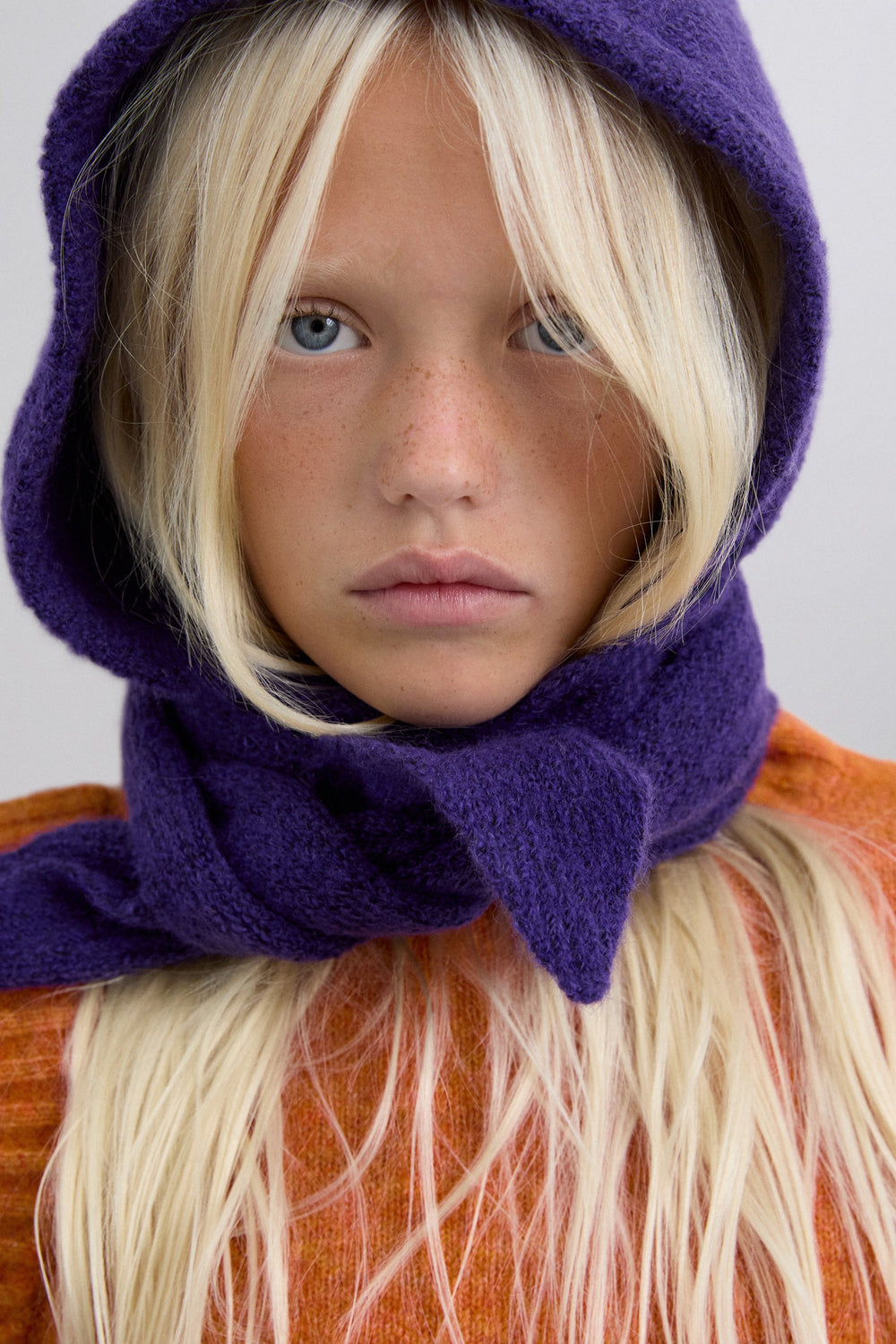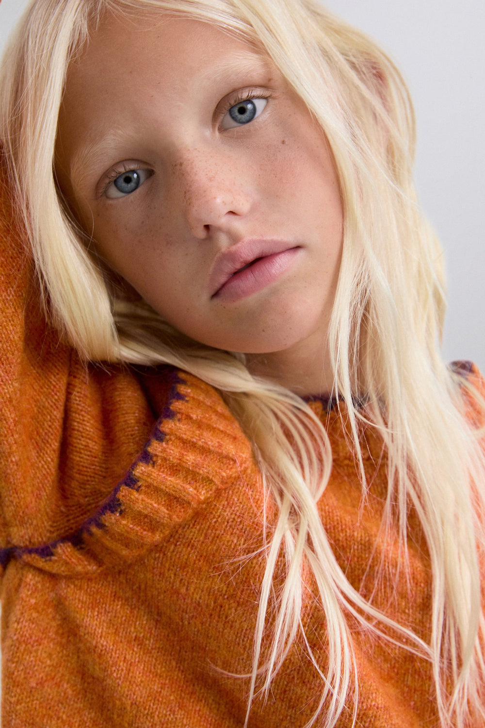 Knit sweater. Round neck. Long sleeves. Contrast embroidered skull detail. Ribbed trim.