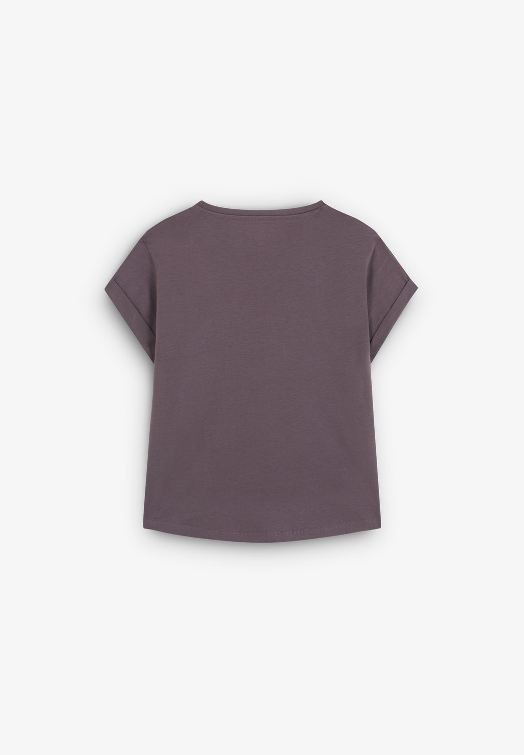 T-shirt made of 100% BCI cotton. Short sleeve. Round neck. Front print with rhinestone detailing.