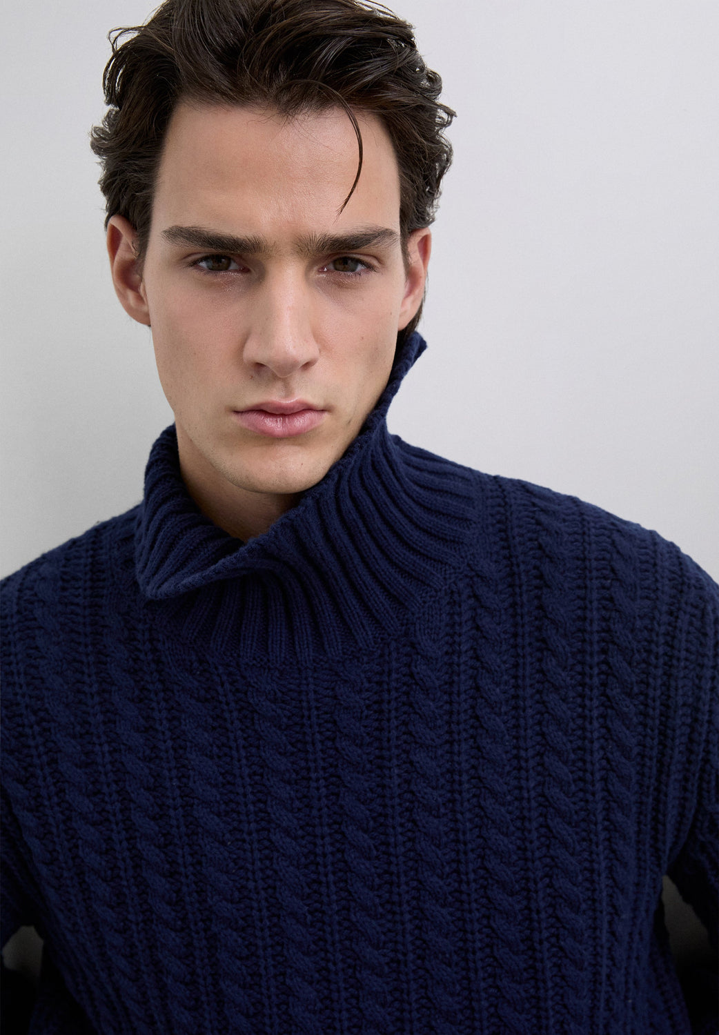Cable-knit sweater. High collar. Long sleeves. Regular fit.