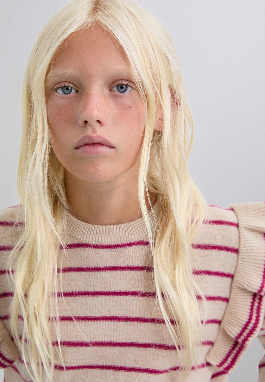 Sweater made of wool. Stripe print. Round neck. Ruffle detail on shoulders. Matching embroidered skull on the chest. Ribbed trim.