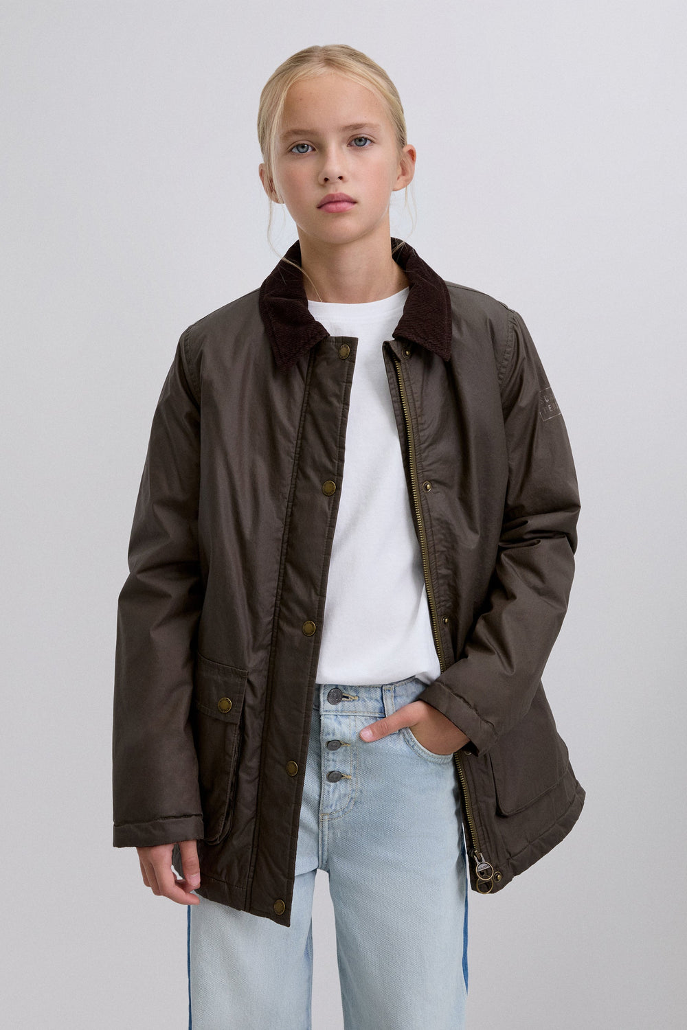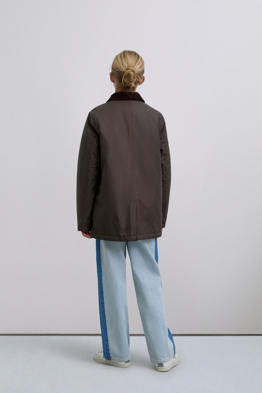 Jacket made of 100% BCI cotton. Contrast shirt collar. Long sleeves. Two front pockets with buttoned flap. Front button fastening. Logo print detail on sleeve.