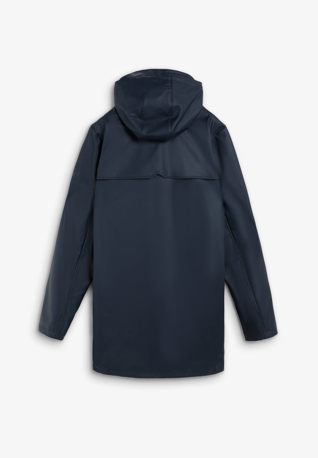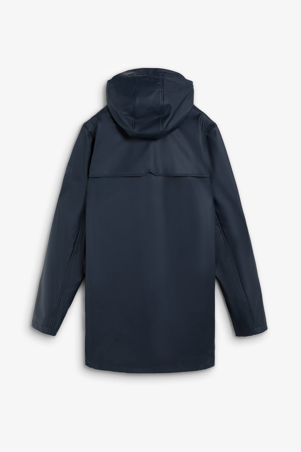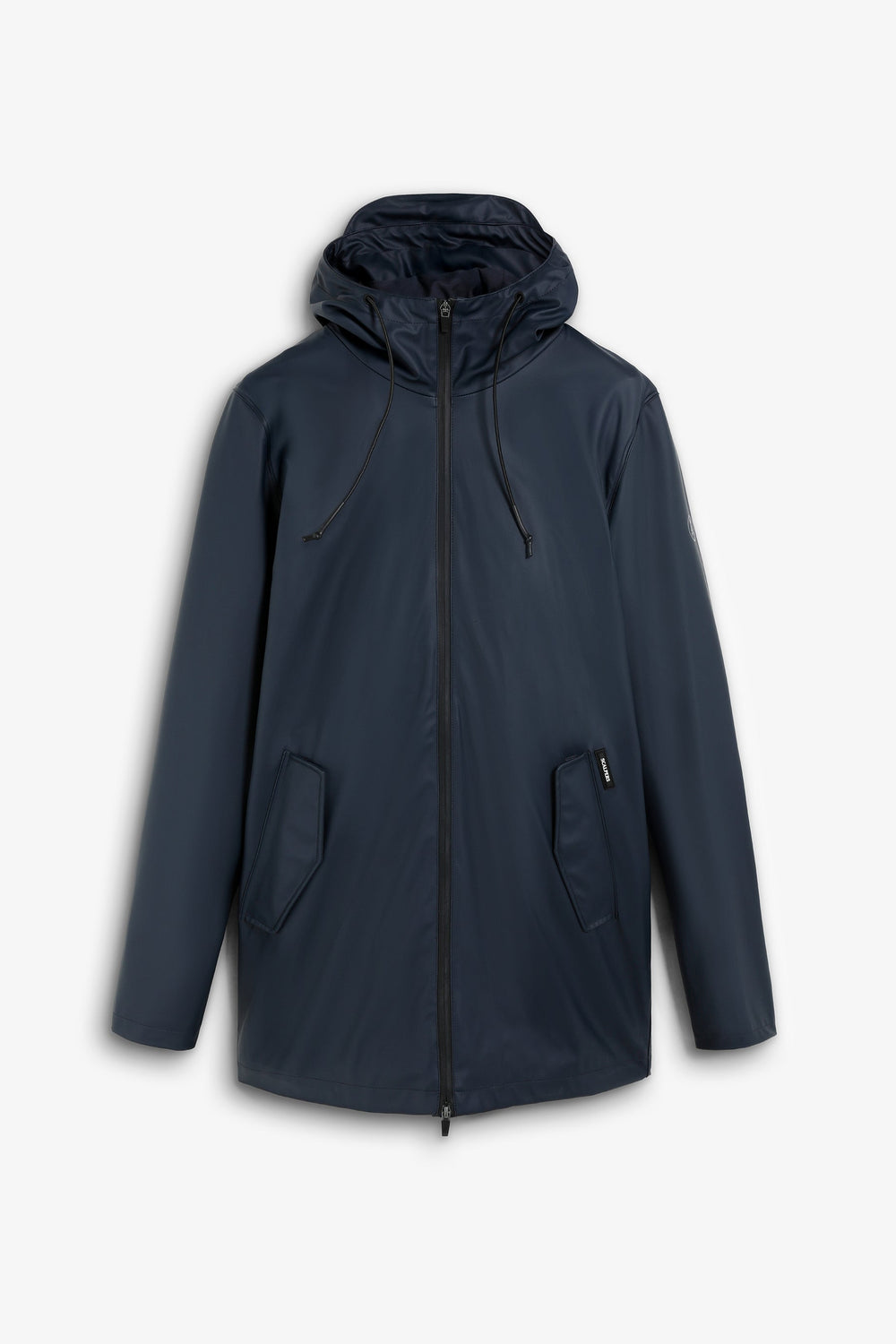 Waterproof jacket. Collar with an adjustable drawstring hood. Zip fastening. Long sleeves. Side pockets with placket and snap button. Contrast rubberised logo detail on lower front and contrast skull on sleeve.