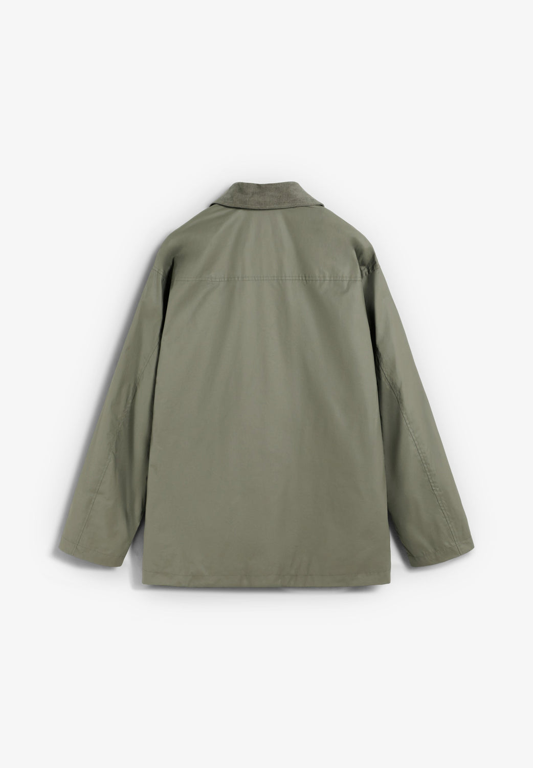 Jacket made of 100% BCI cotton. Waxed effect fabric. Two front pockets. Corduroy detail on collar and inside pocket. Front zip fastening concealed by placket with press-studs.