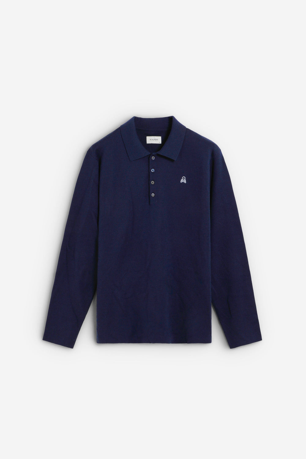 Long sleeve polo shirt made of a wool blend. Matching embroidered skull detail on the chest. Shirt collar. Front button fastening
