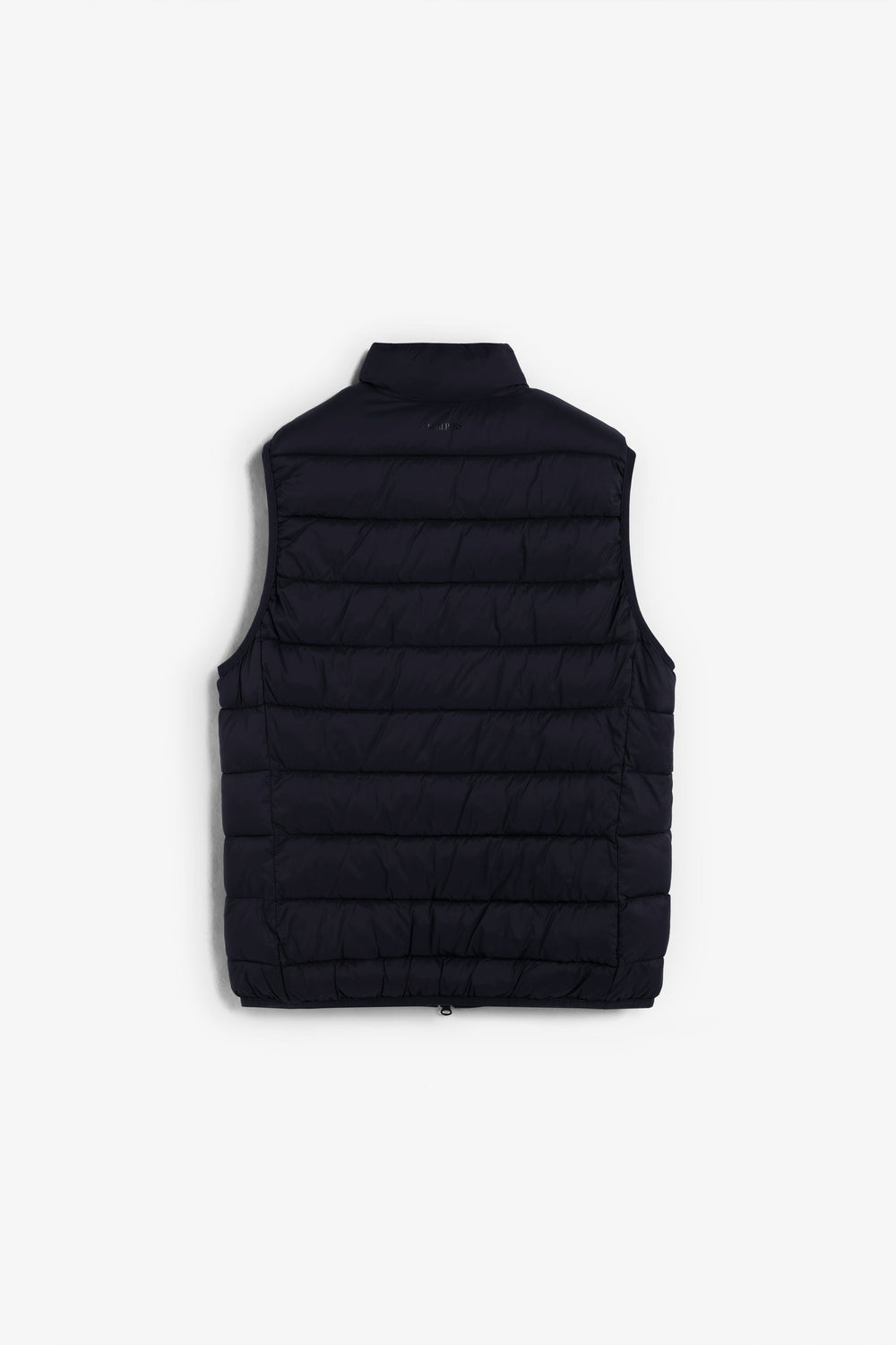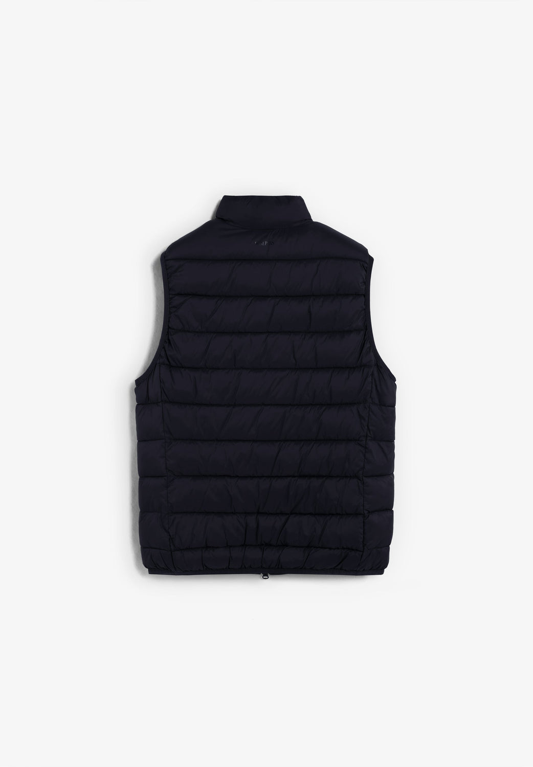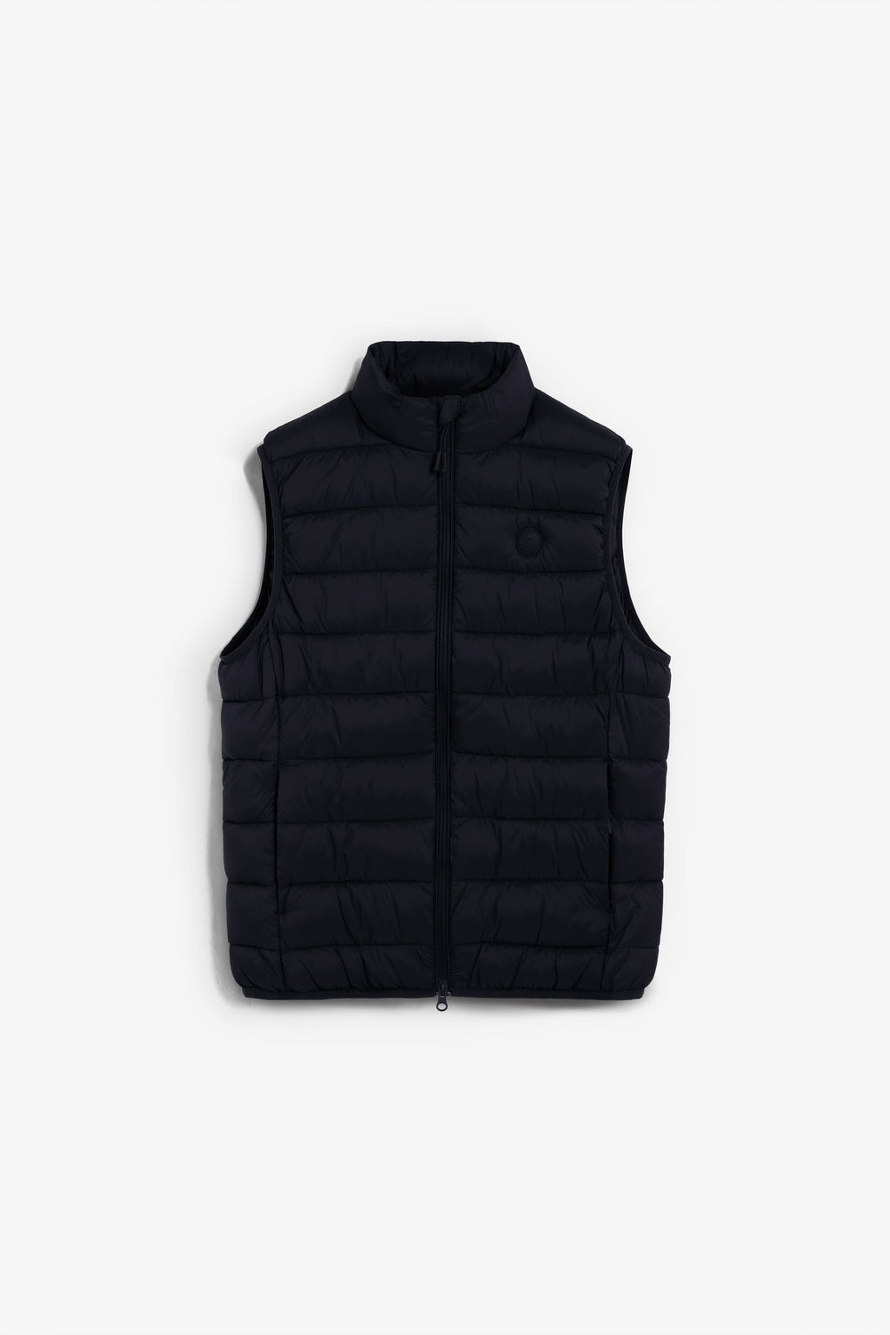 Puffer vest made of cotton and recycled polyester fabric. Slim fit. High collar. Double slider zip fastening. Zip pockets and an inner pocket. Logo detail on the chest