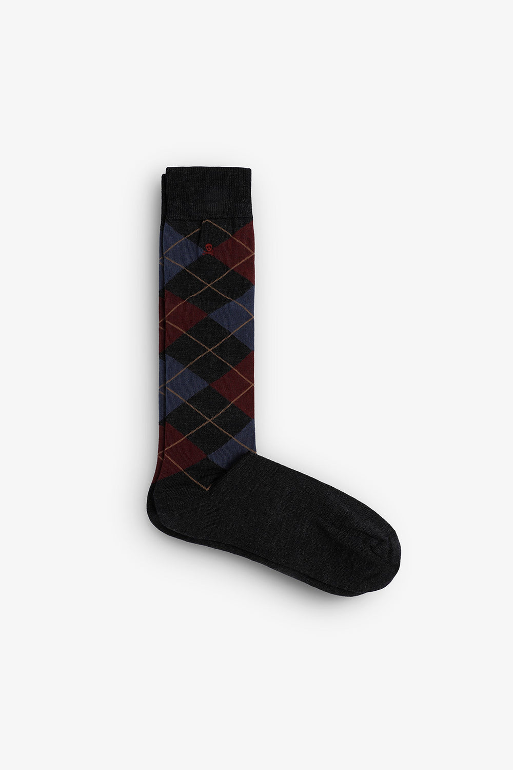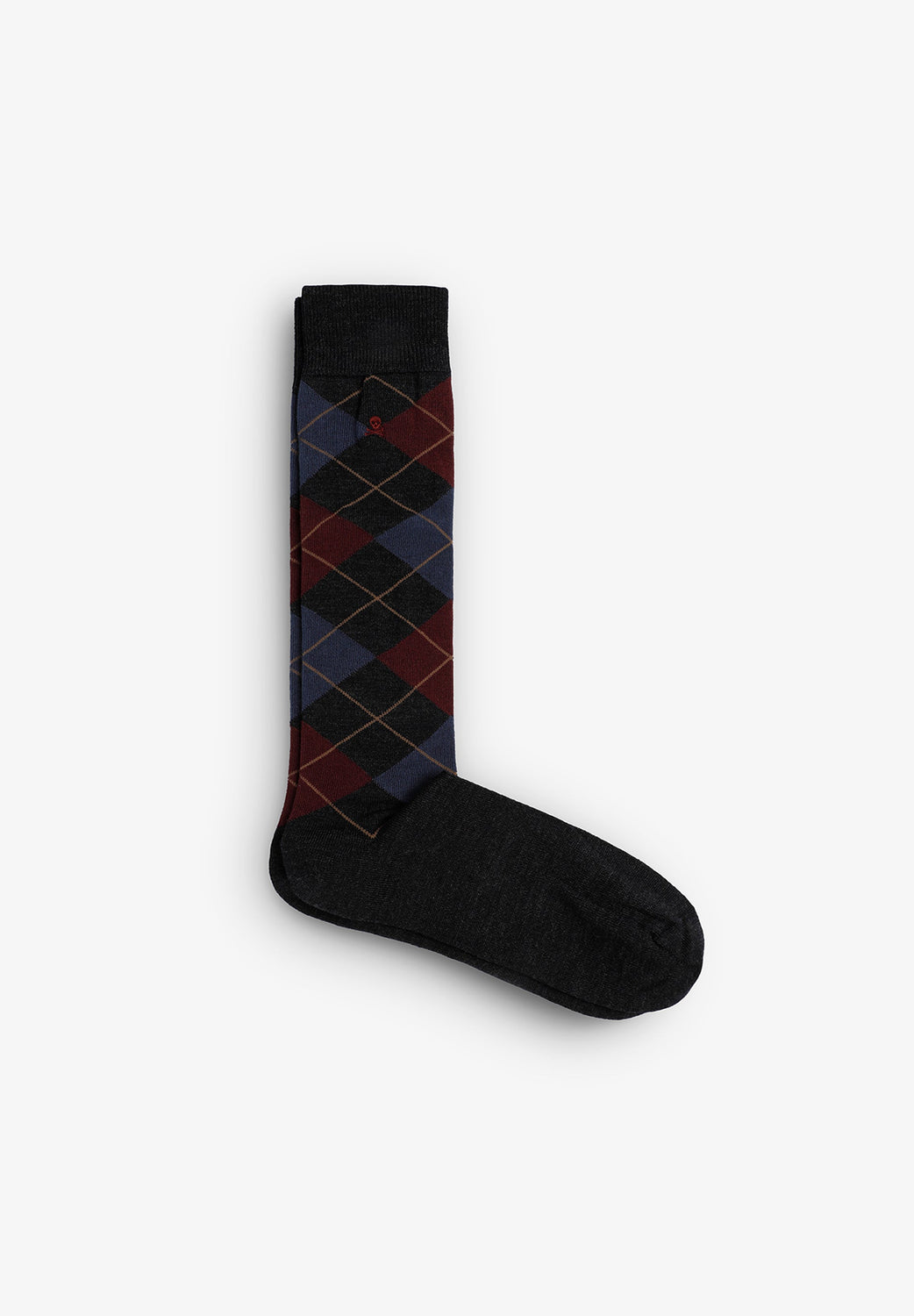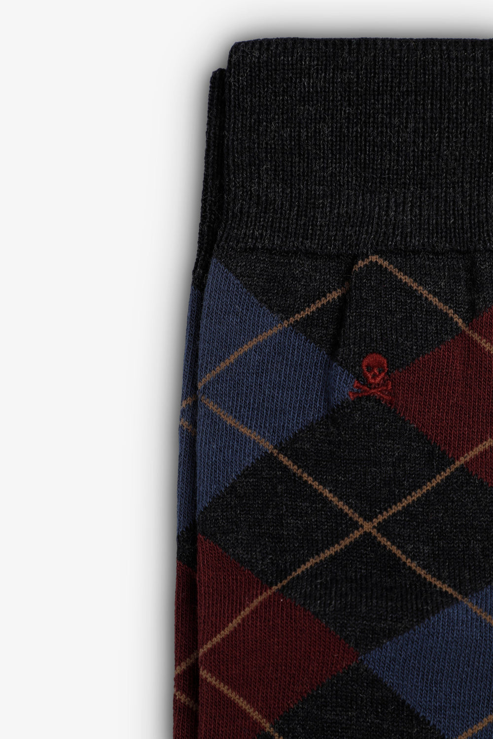 Over-the-calf socks in a wool blend. Diamond pattern. Embroidered skull detail at the top.
