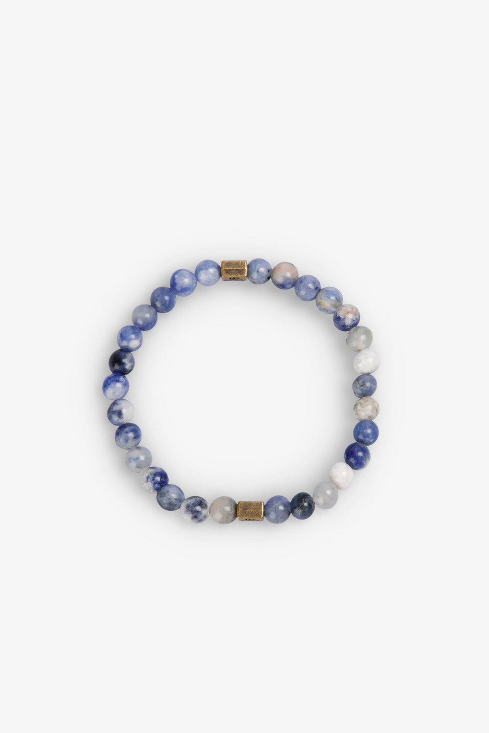 Bracelet made of round natural stone in different shades. Metal appliqués with logo.