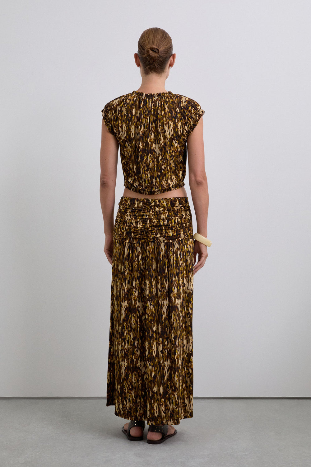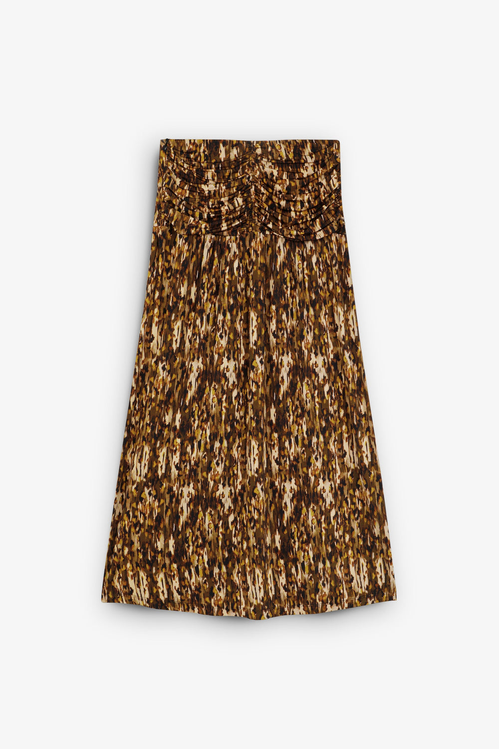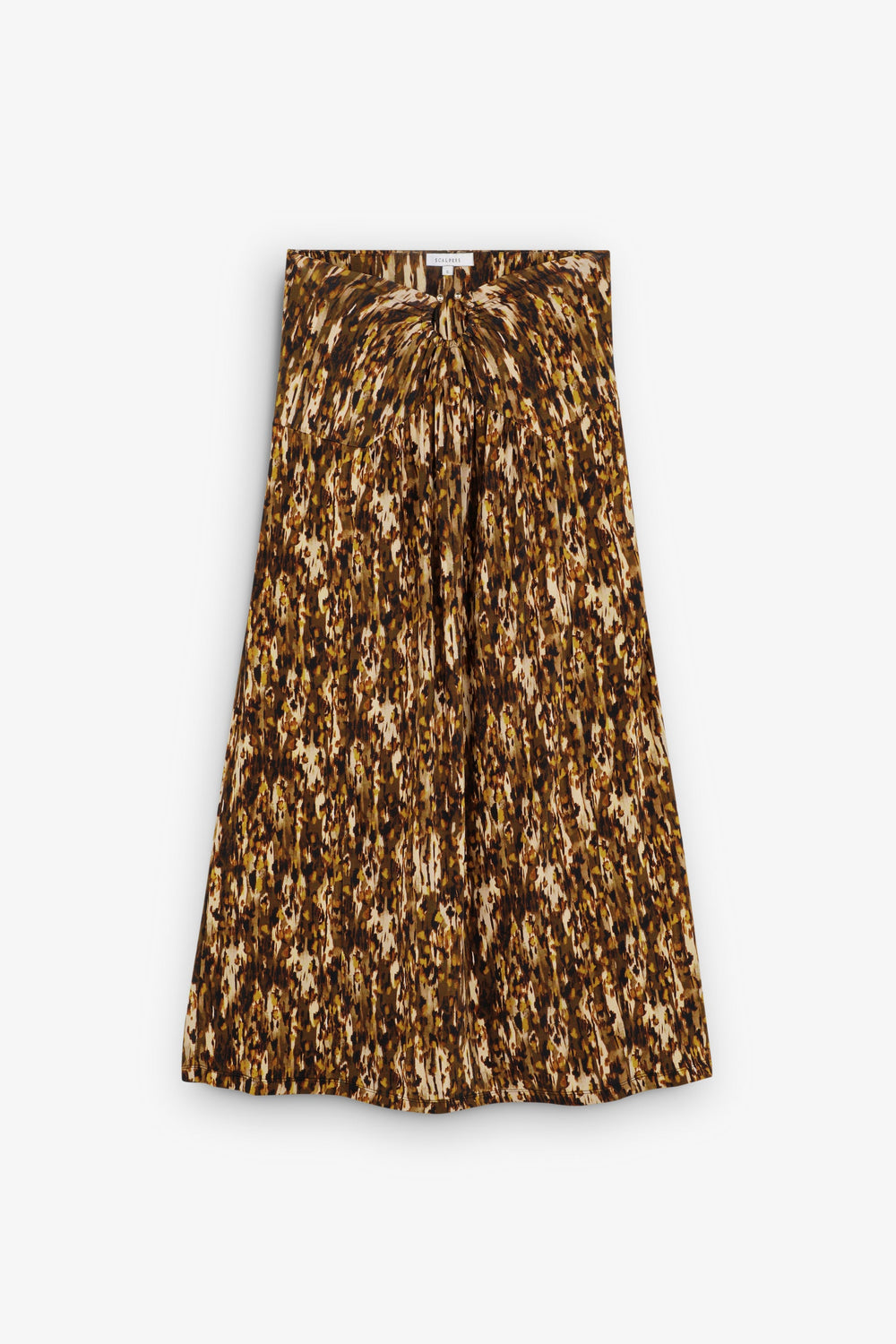 Printed skirt with metal buckle detail on the front. Midi. Flared.