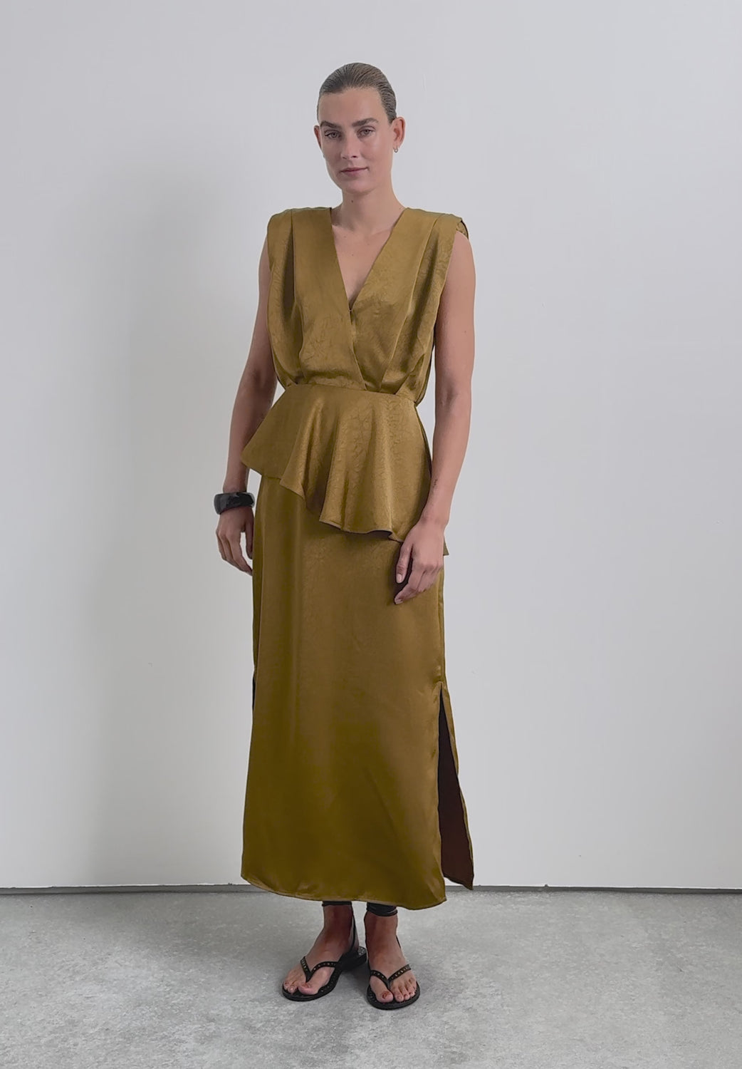 Midi skirt made of flowing fabric with texture. Concealed side zip fastening and split leg.