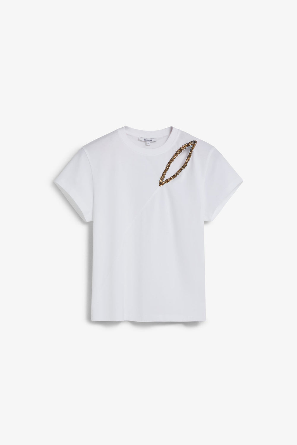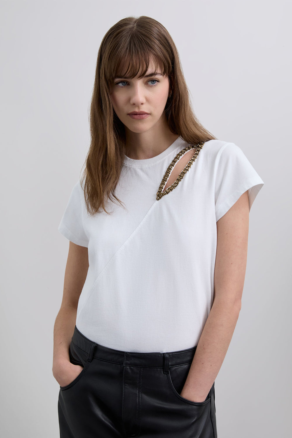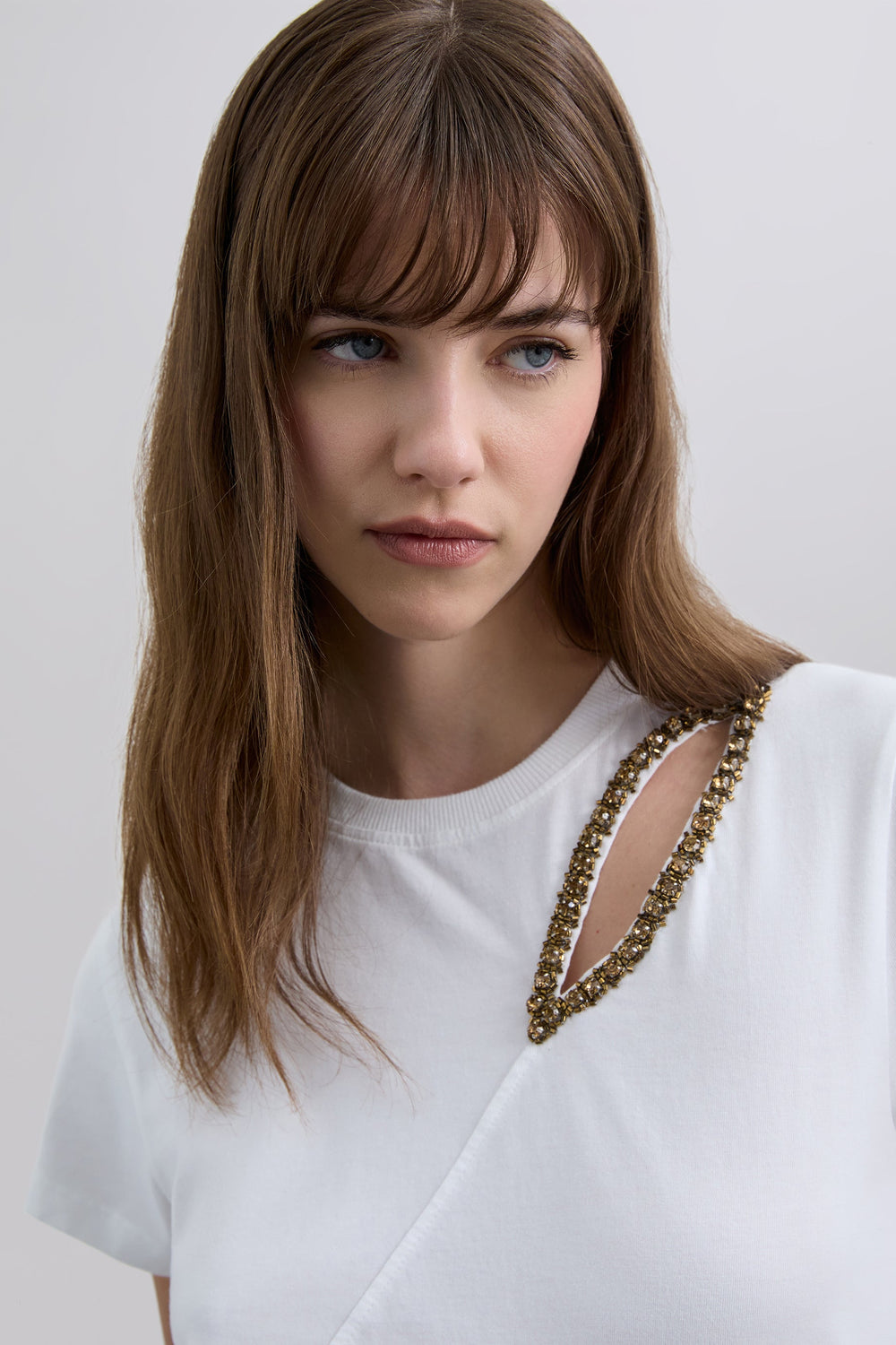 Regular fit T-shirt with round neck and short sleeves. Cut-out detail with embellishment on the front.