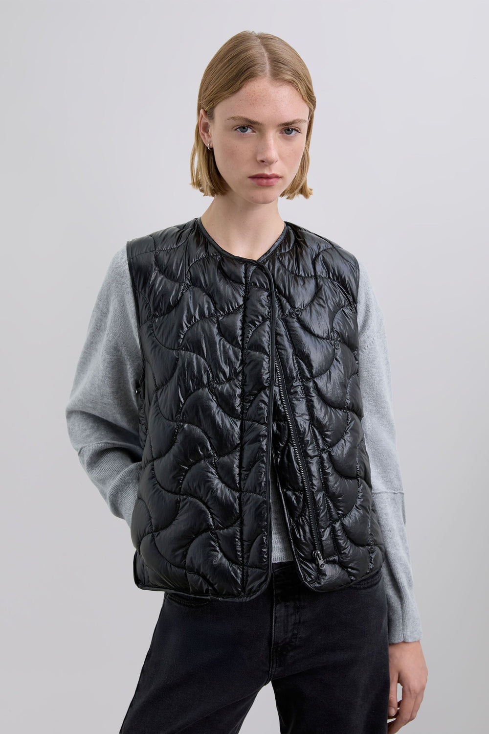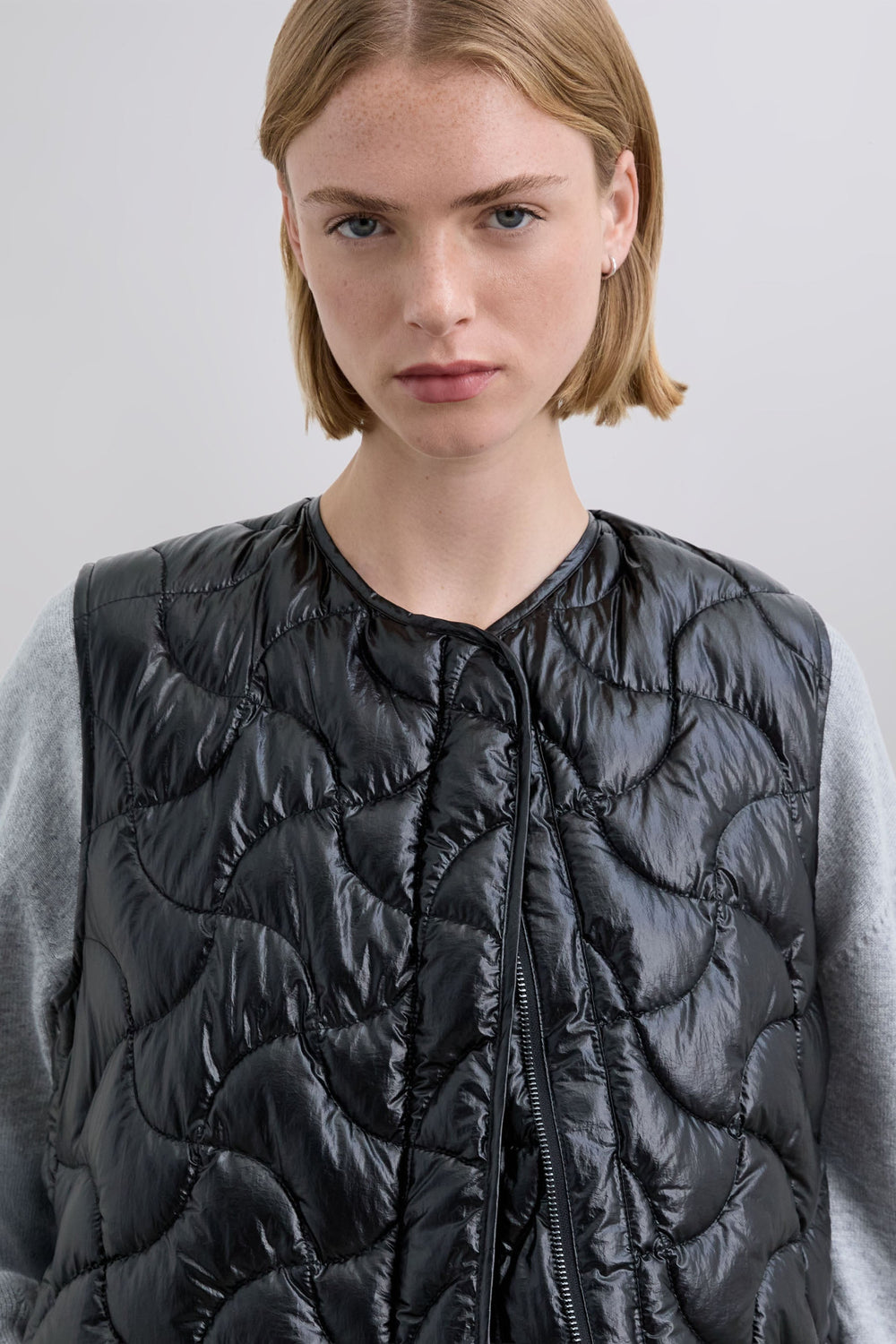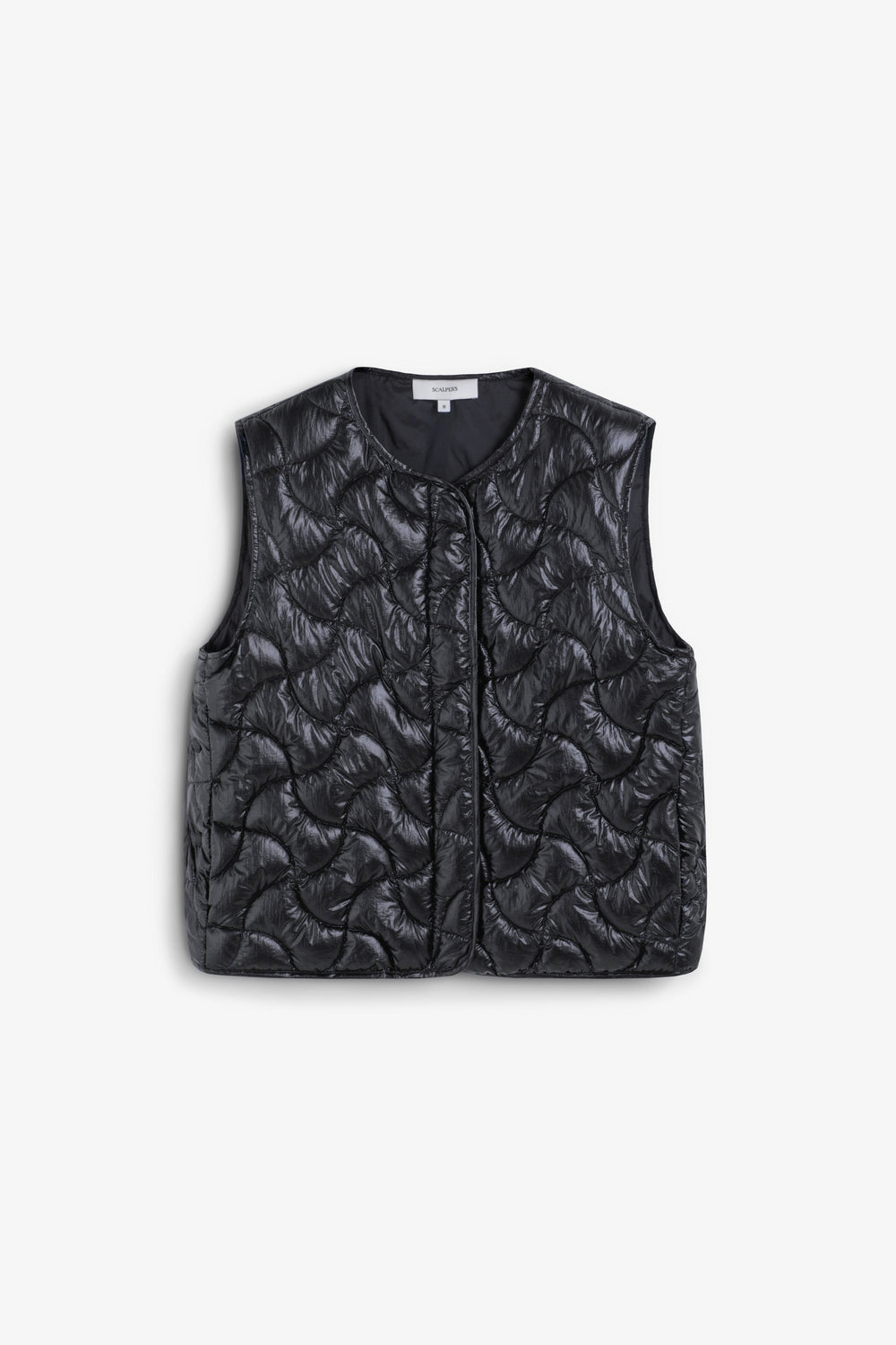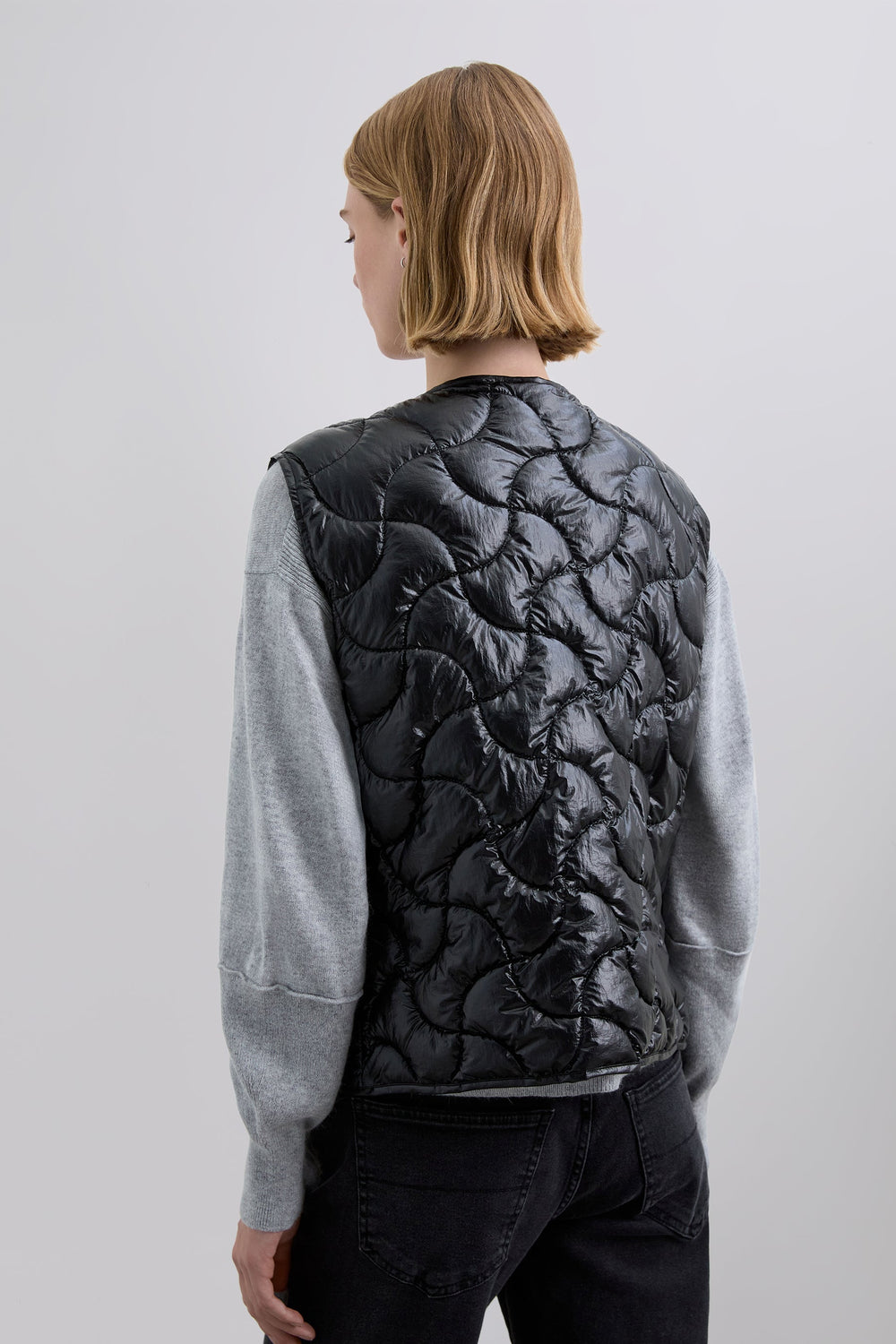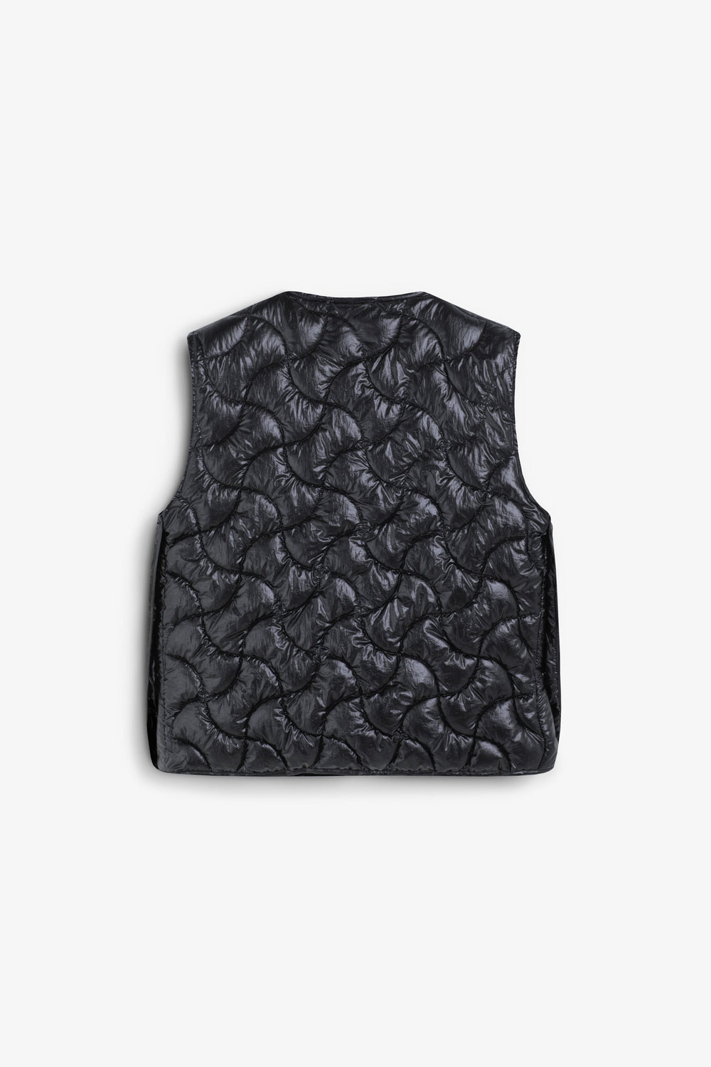 Quilted gilet made of technical fabric. Patterned stitching. Front press-stud fastening.