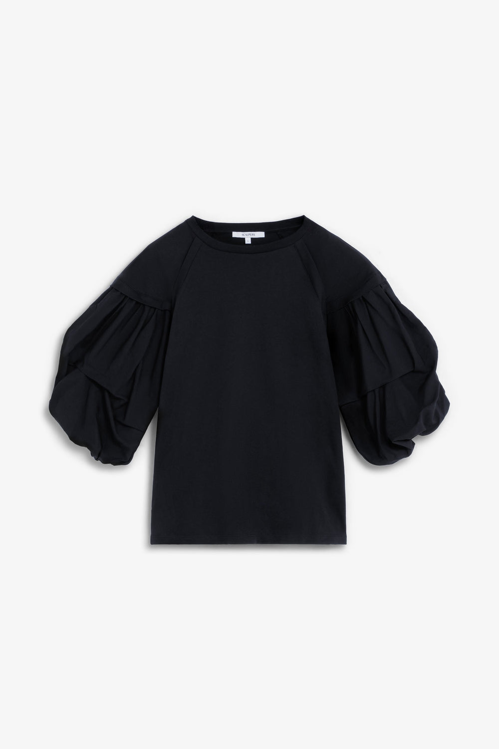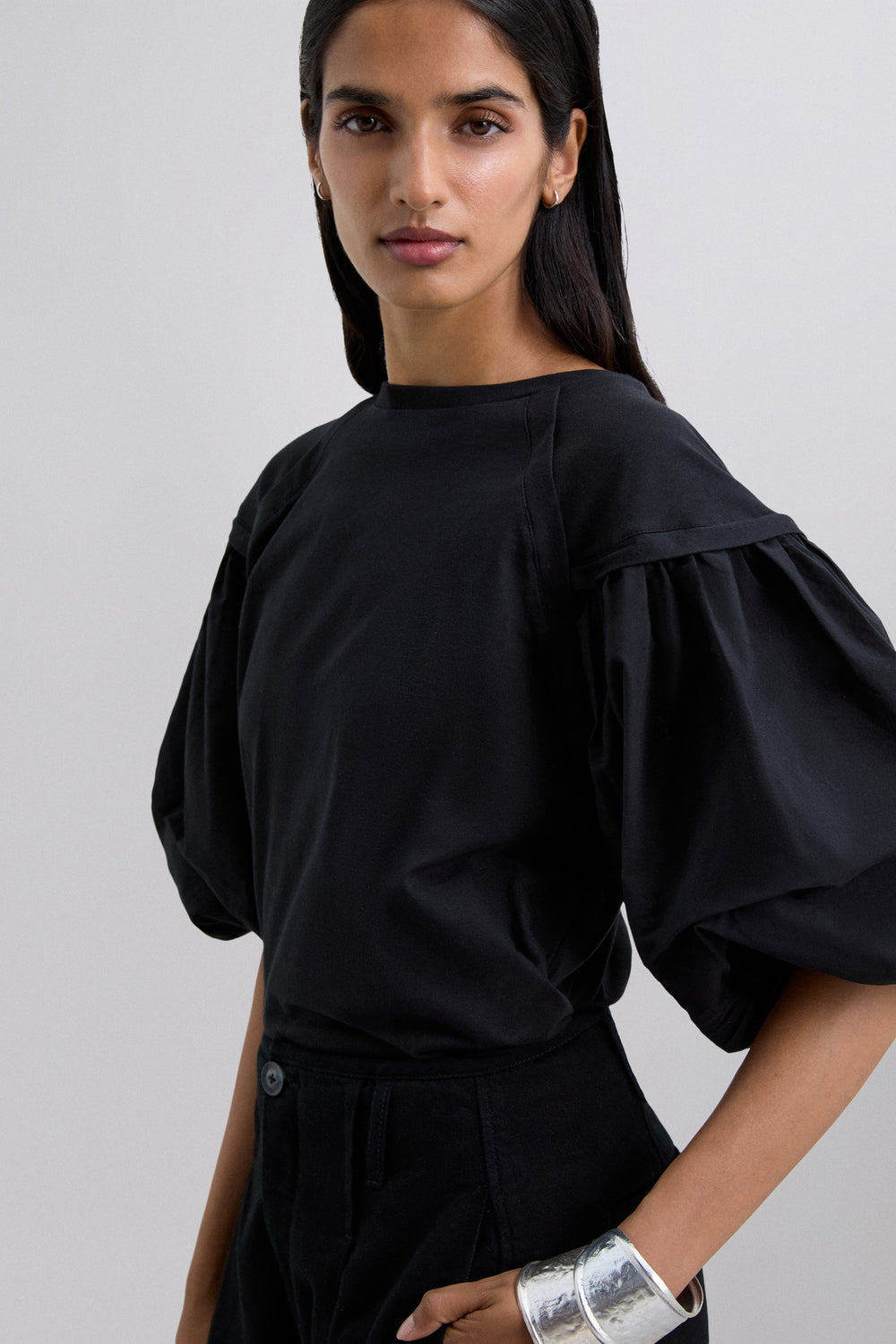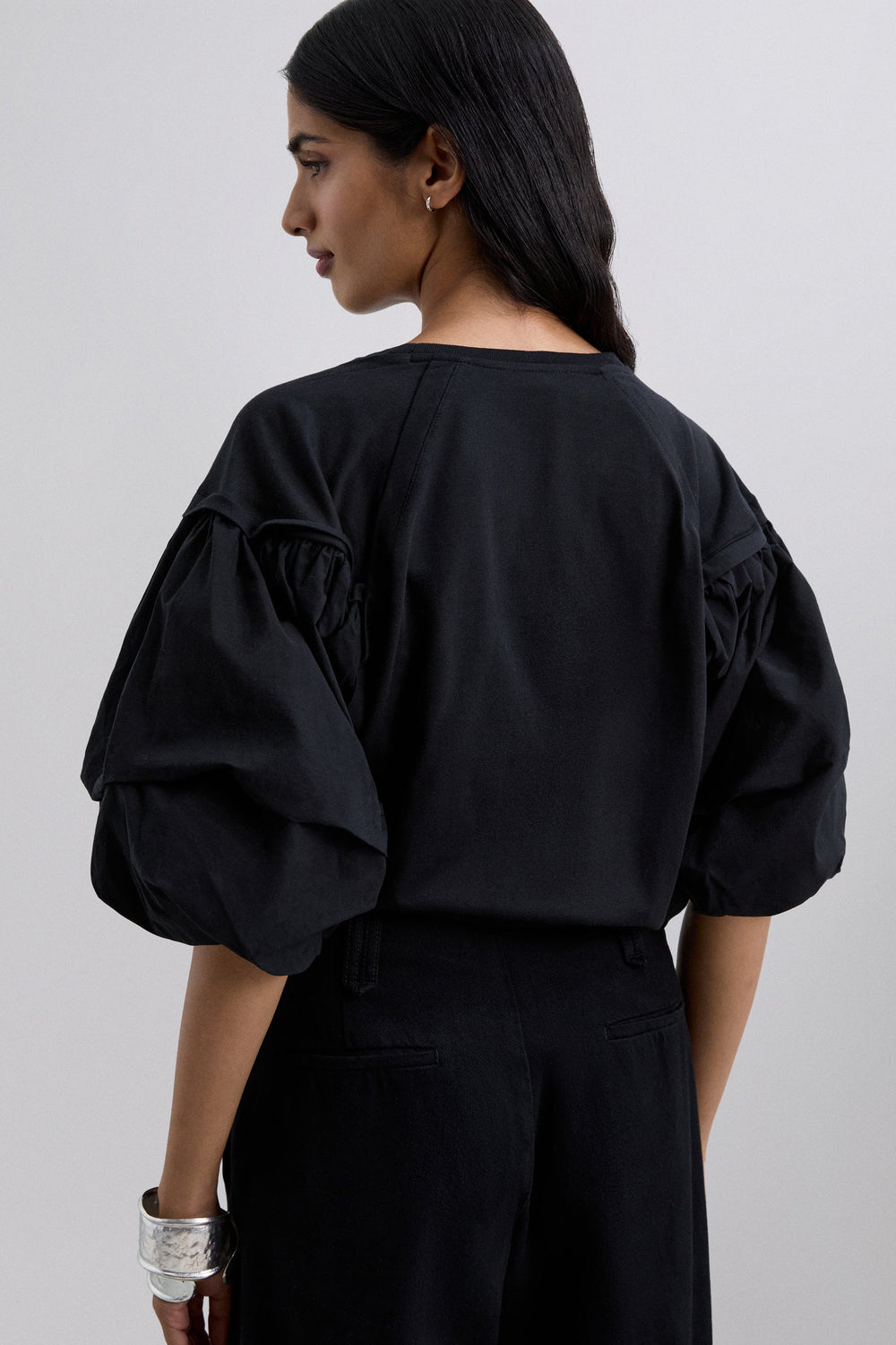 T-shirt made of 100% BCI cotton. Regular fit, round neck and long puff sleeves.