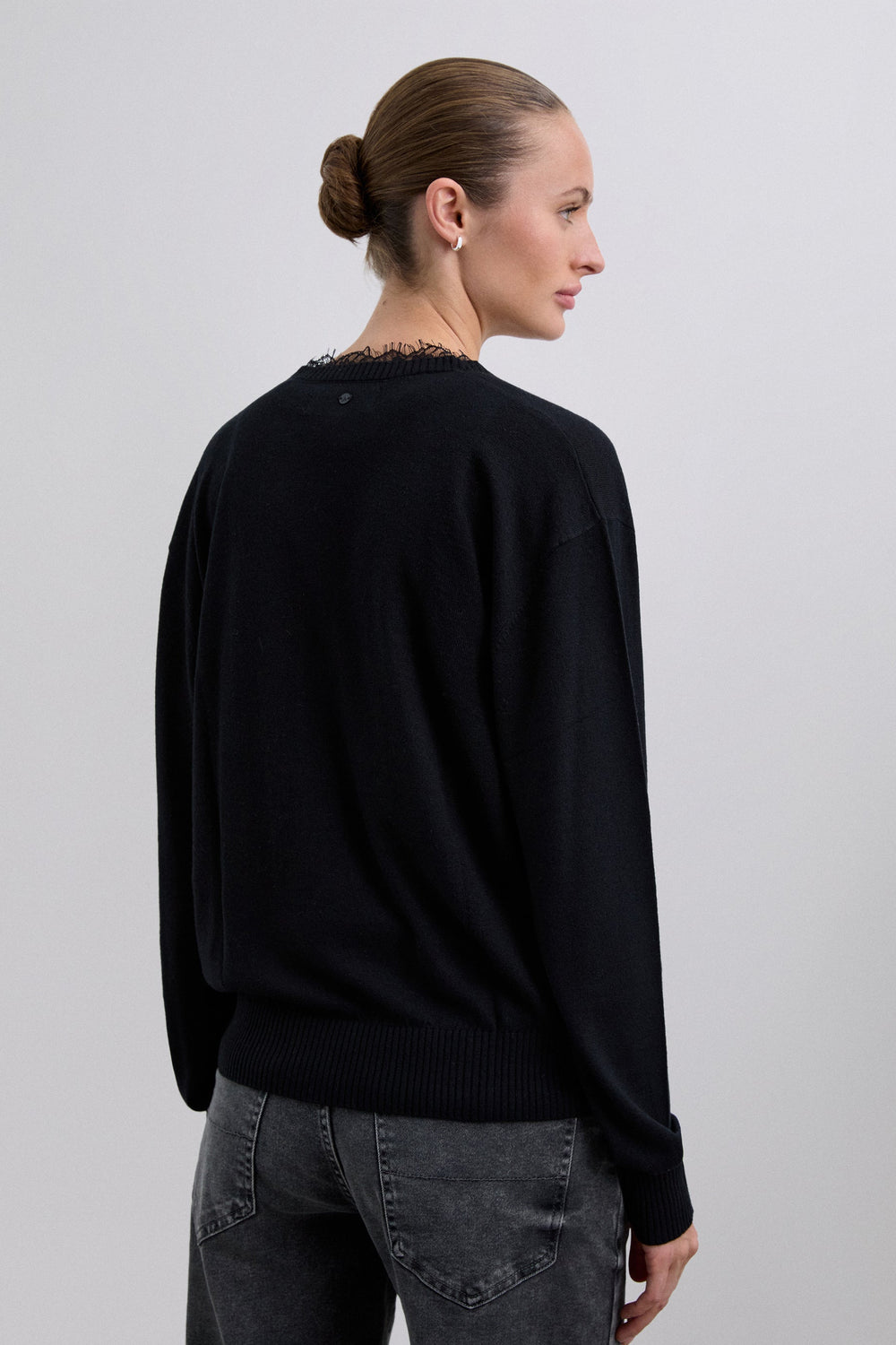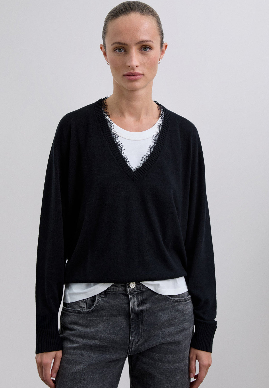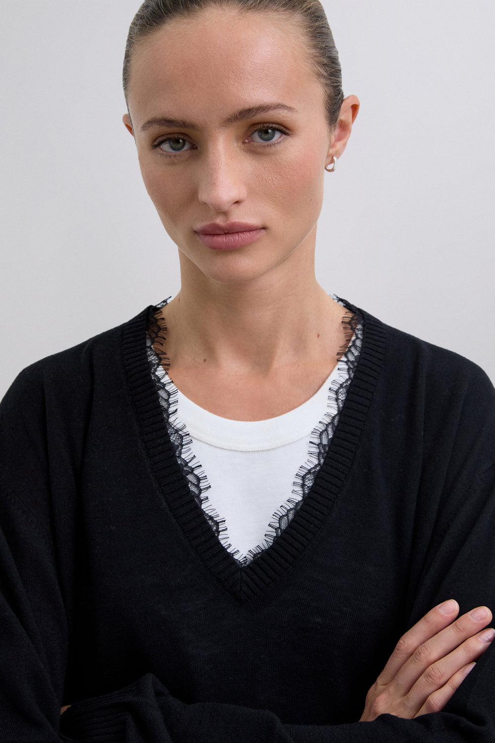 Sweater made of a wool and viscose blend. Regular fit. V-neck with lace details. Long sleeves with ribbed cuffs and hem.