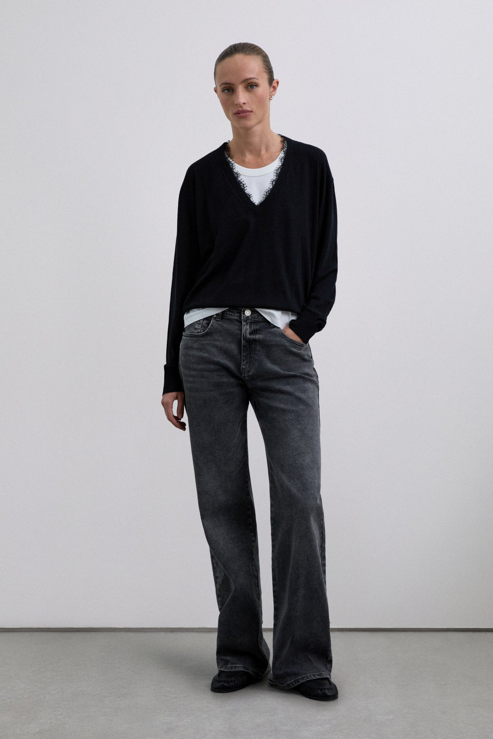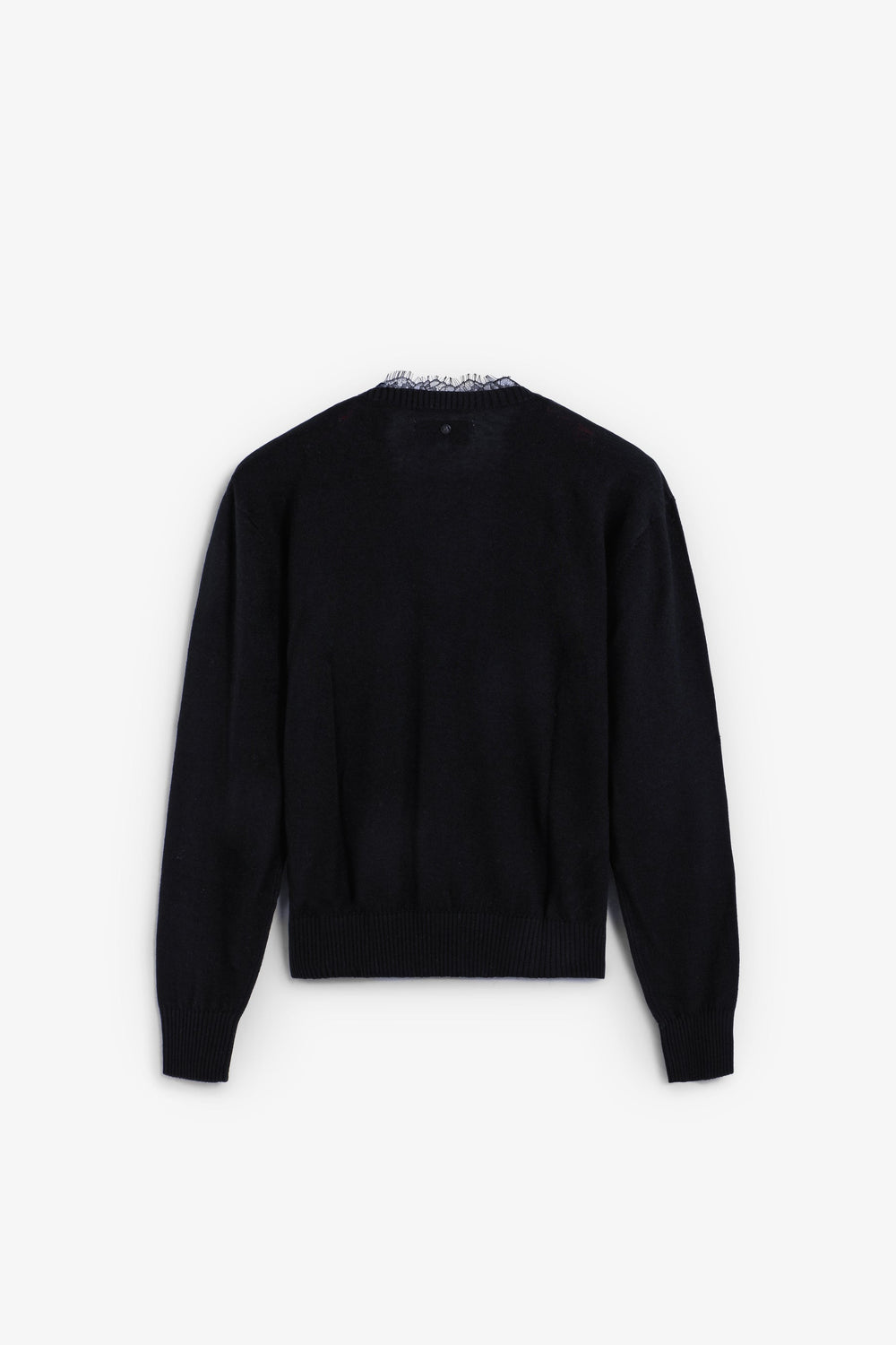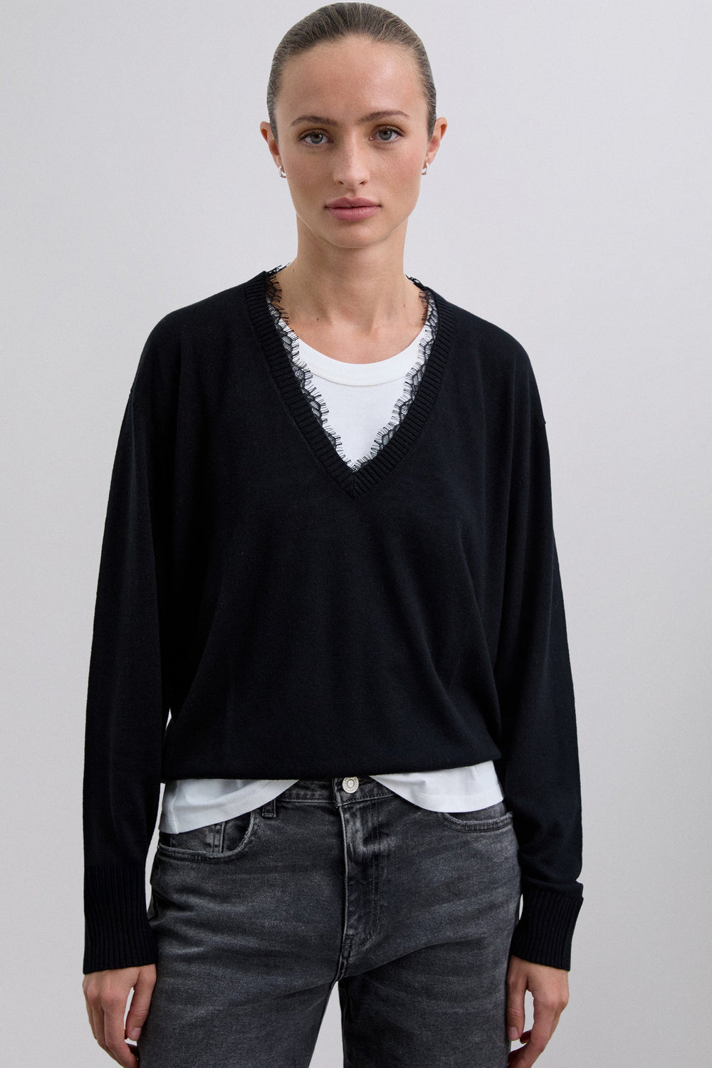 Sweater made of a wool and viscose blend. Regular fit. V-neck with lace details. Long sleeves with ribbed cuffs and hem.
