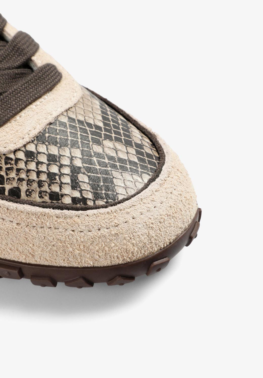 Retro low-top suede sneakers in snake embossed leather and light toned sole. They feature a textured design with logo on the side.