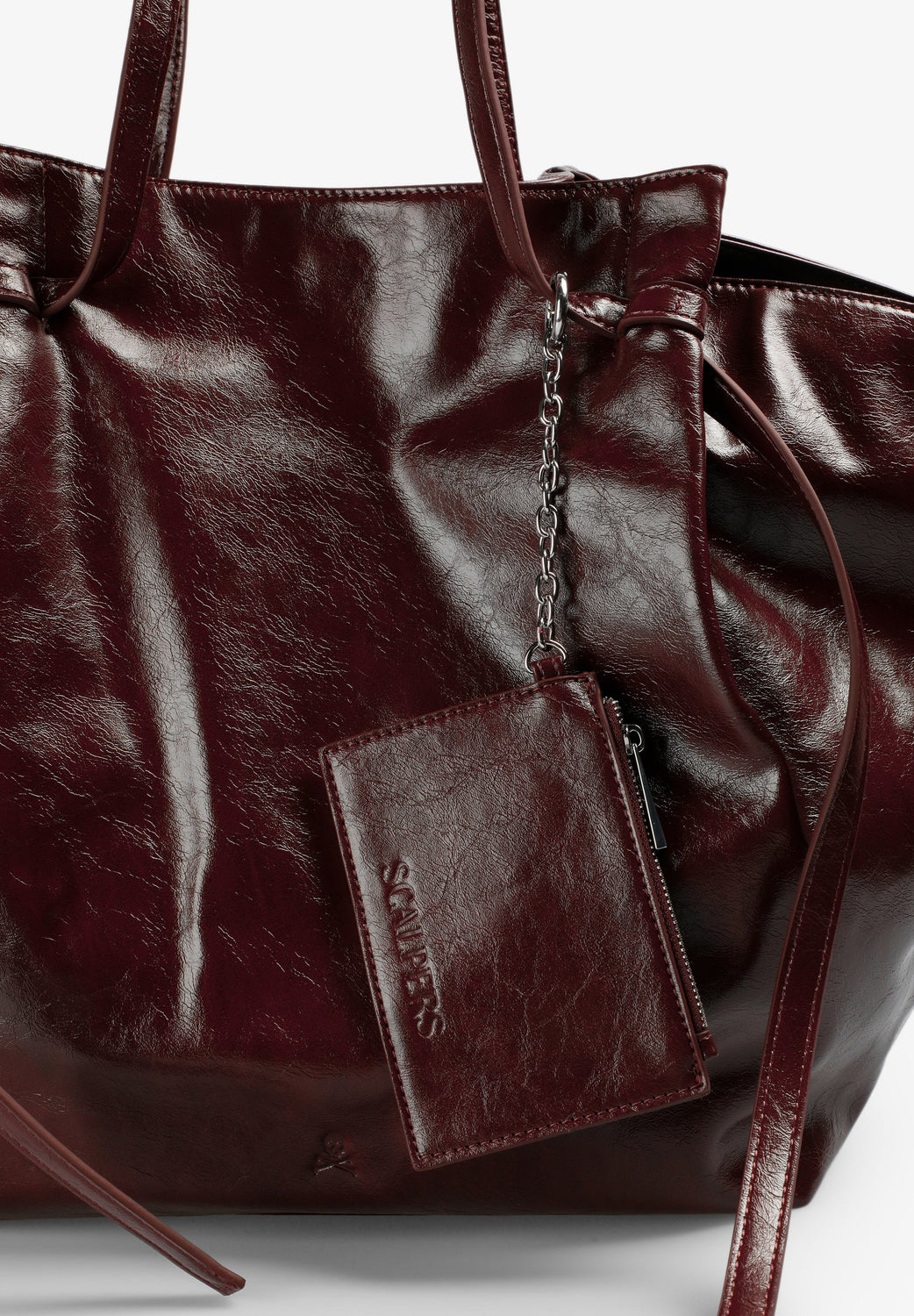 PU tote bag. Lined. Double zipped pocket. Adjustable side straps. Matching wallet inside