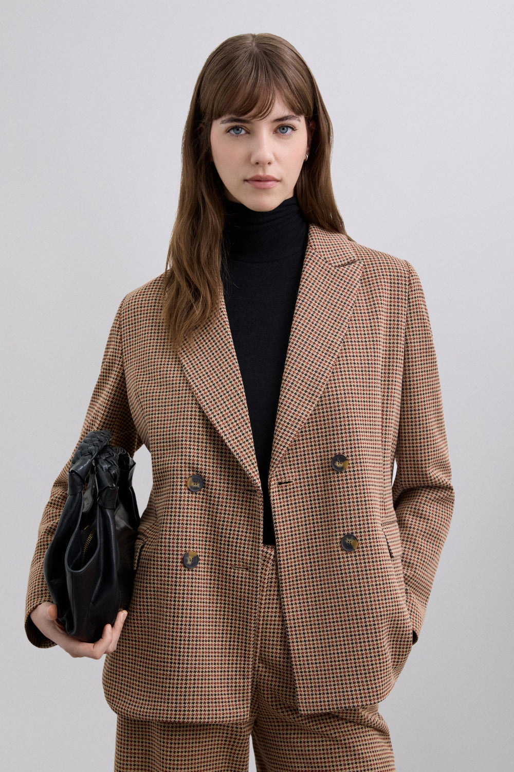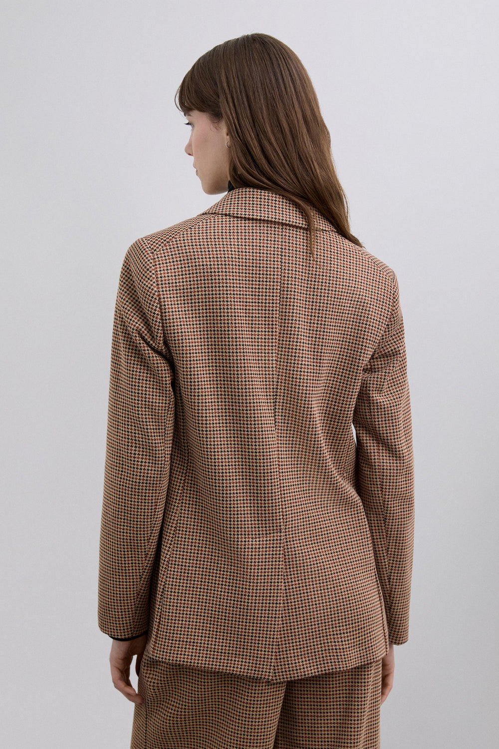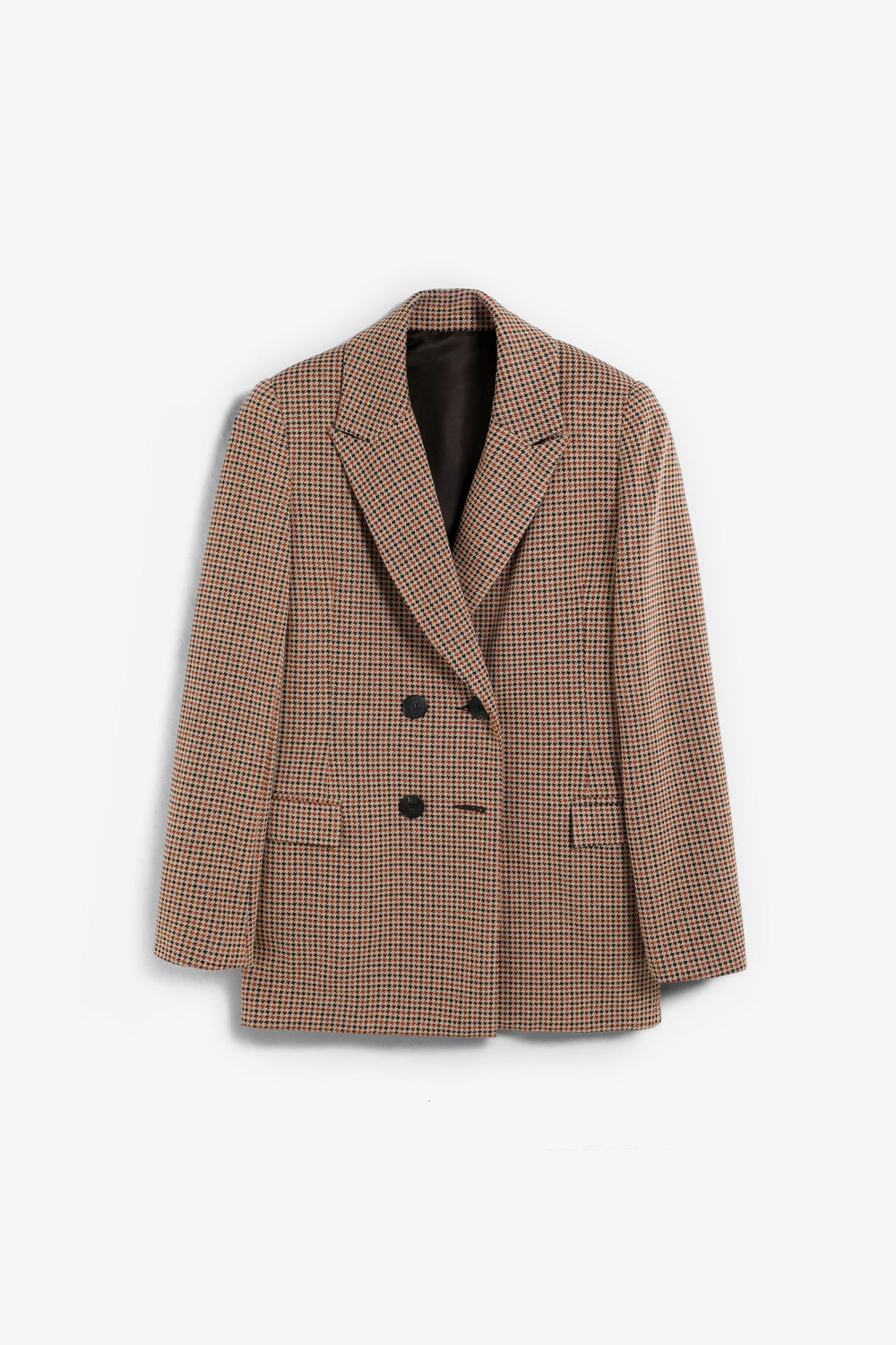 Houndstooth print blazer. Regular fit. Notched lapel collar. Double-breasted button fastening. Front flap pockets.