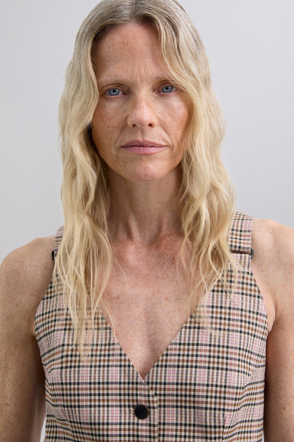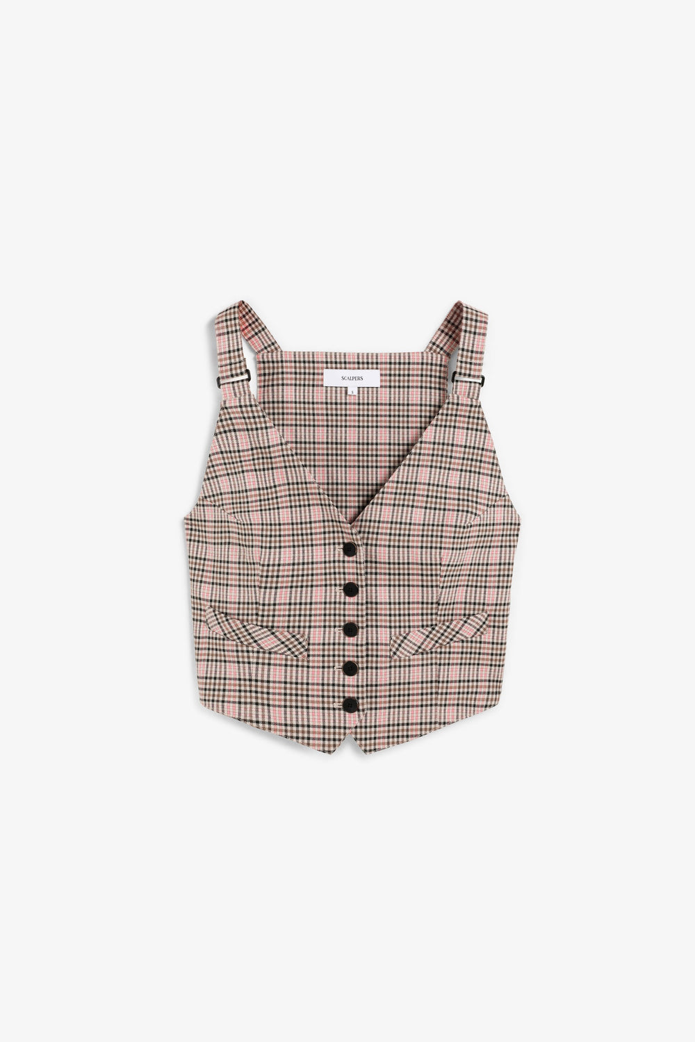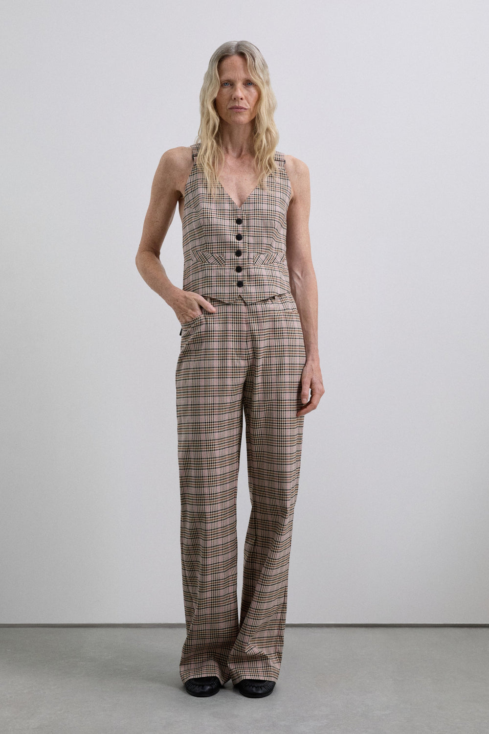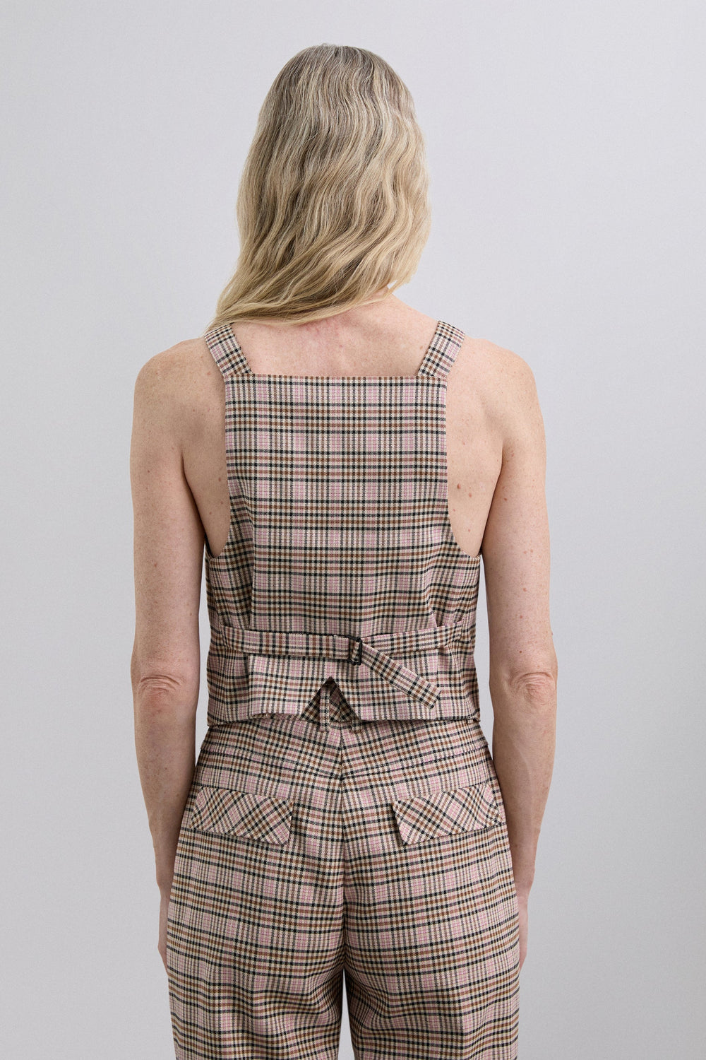 Coat with check print. V-neck, with straps. Front button fastening. Two front pockets.