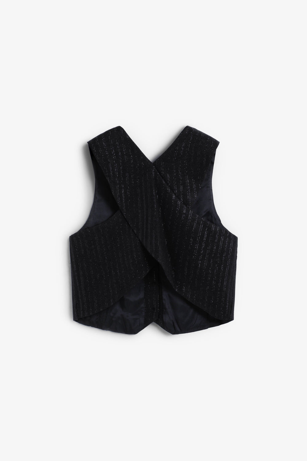 Waistcoat made of flowing fabric with lurex stripe print. Slim fit. V-neck. Sleeveless. Crossed back. Button fastening.