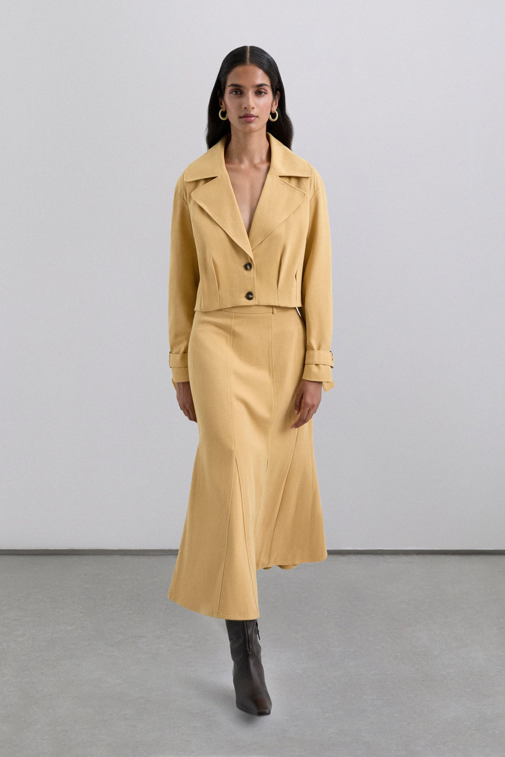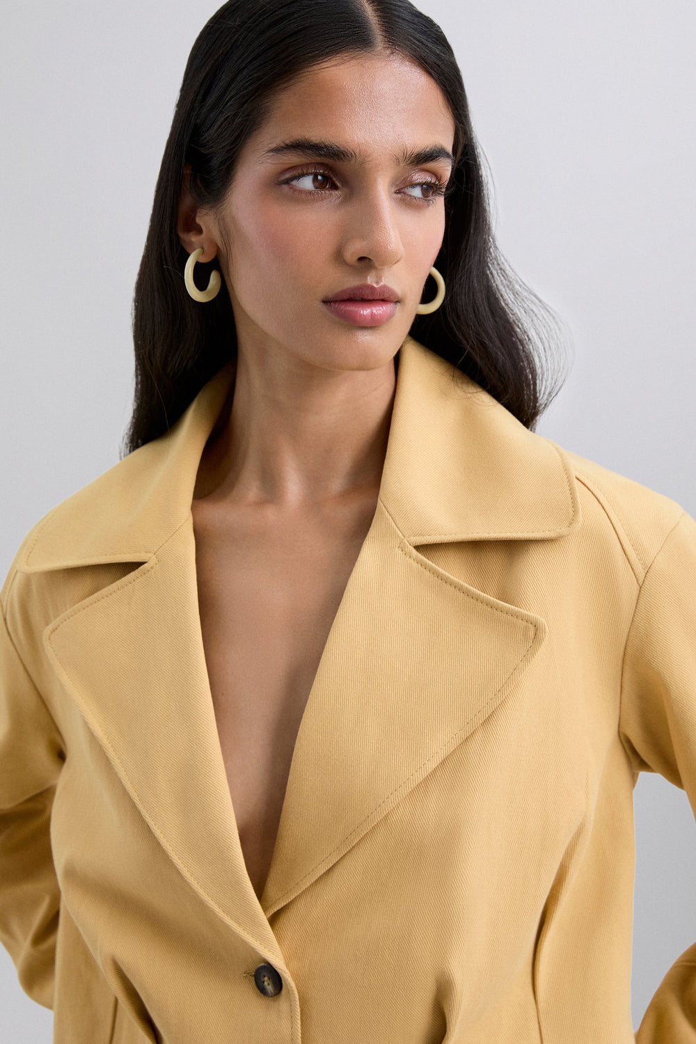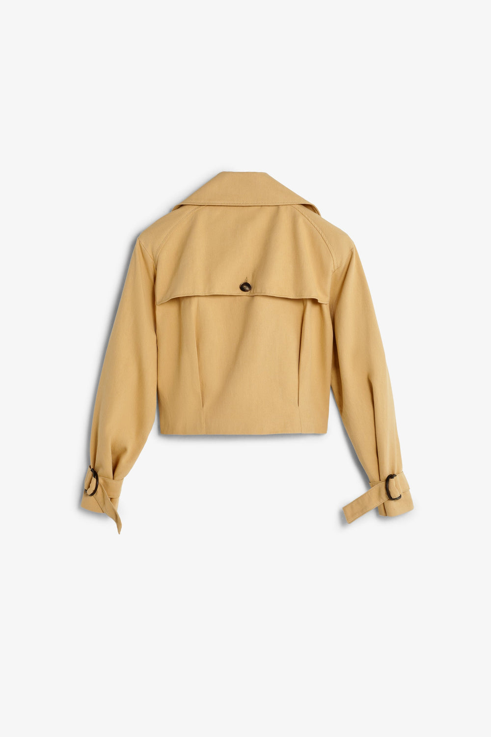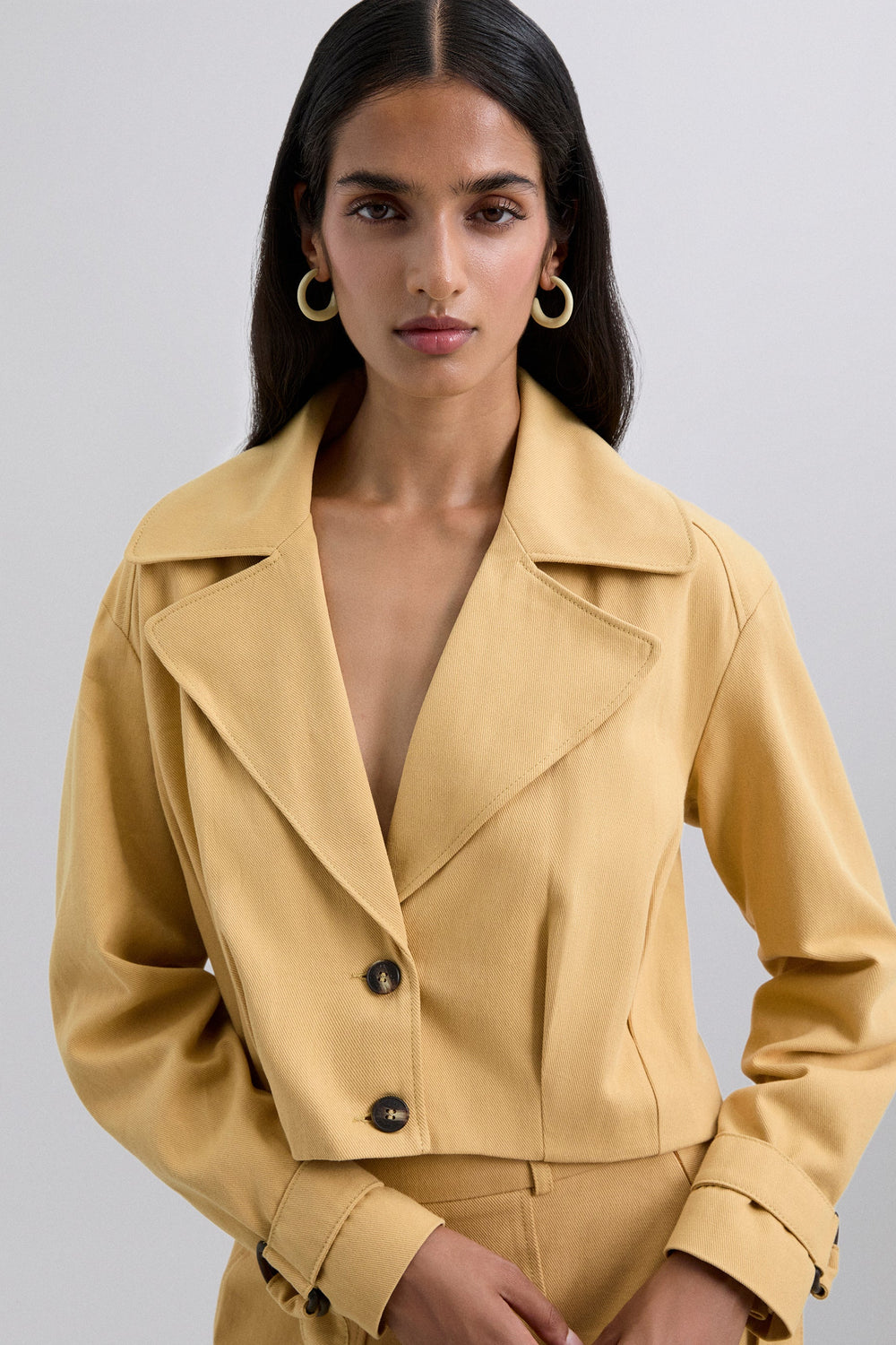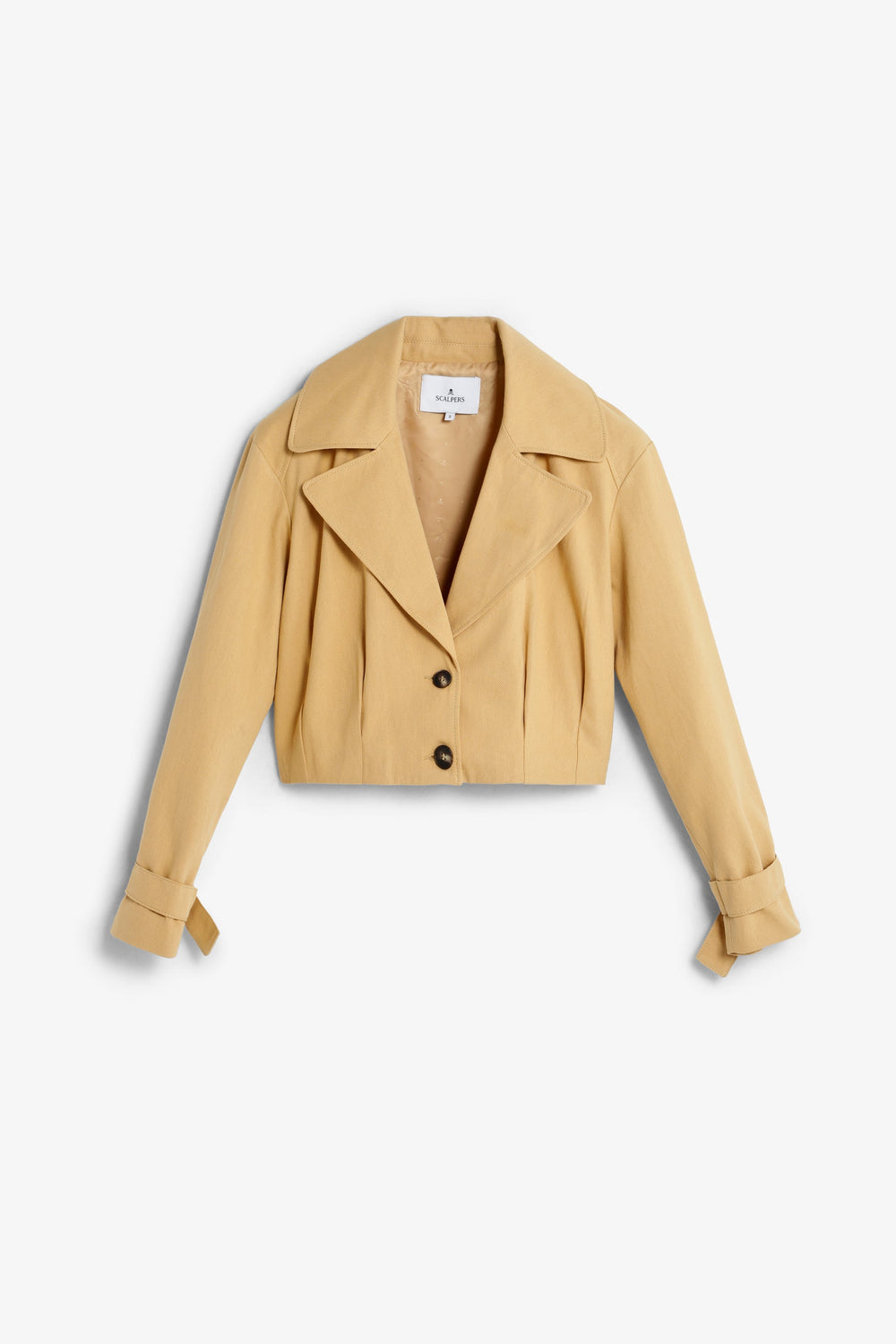 Short jacket with notched lapel and front button fastening. Long sleeves with closed cuffs.