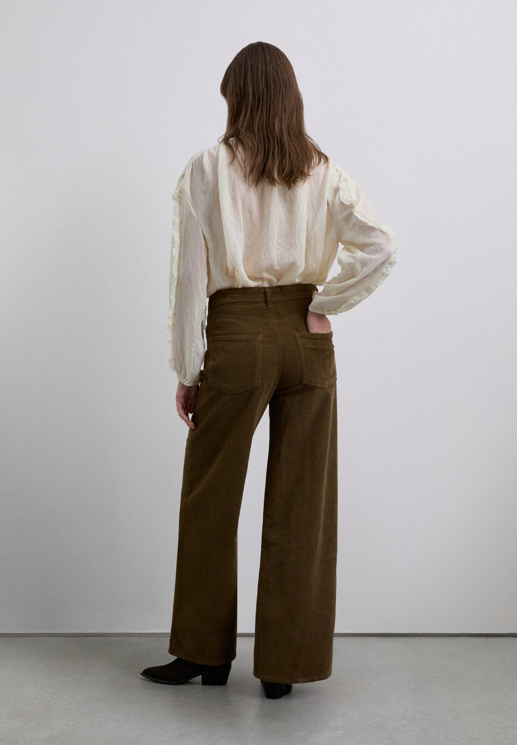 Trousers made of a cotton blend. Mid-rise and straight cut. Zip and button fastening. Front and back pockets.