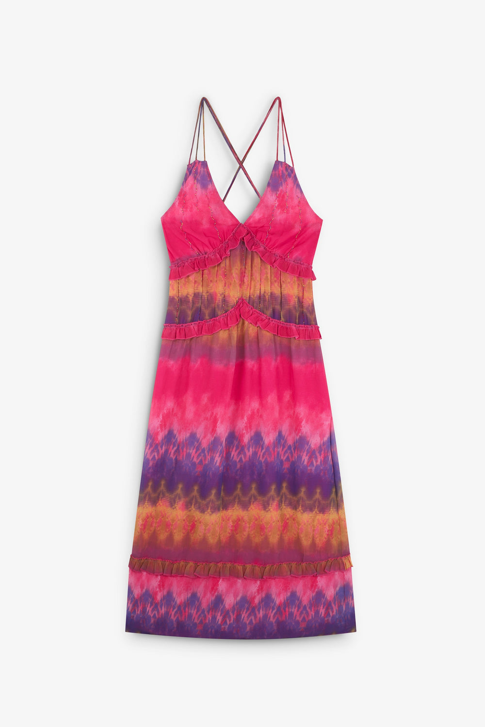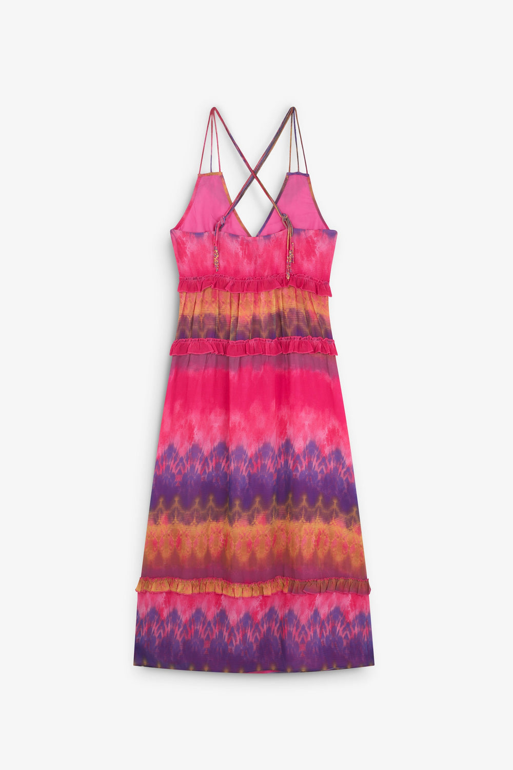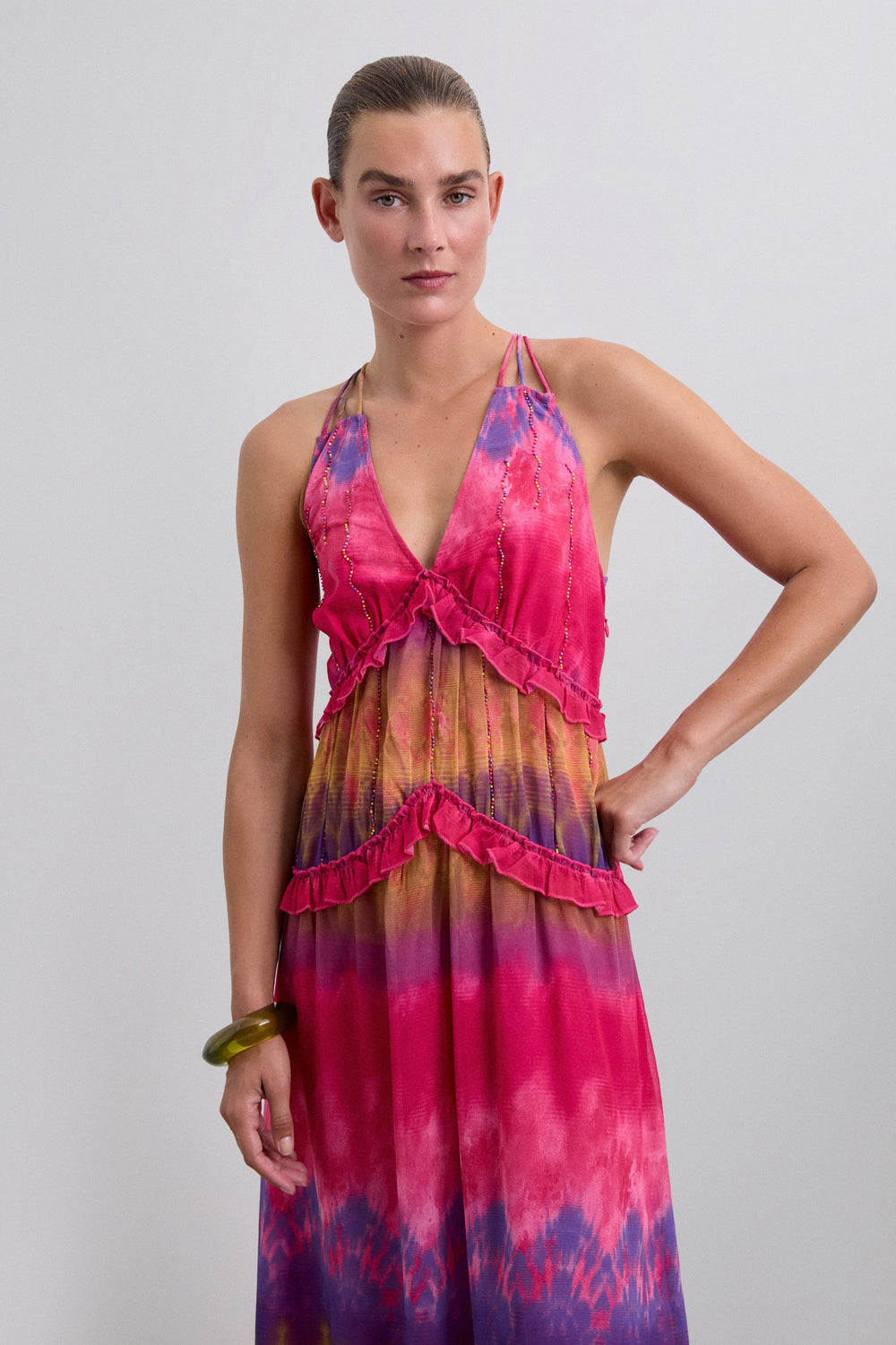 Long dress made of flowing fabric. V-neck with tie-dye print and ruffle details. Hanging ribbons with coloured beads on collar and waist.