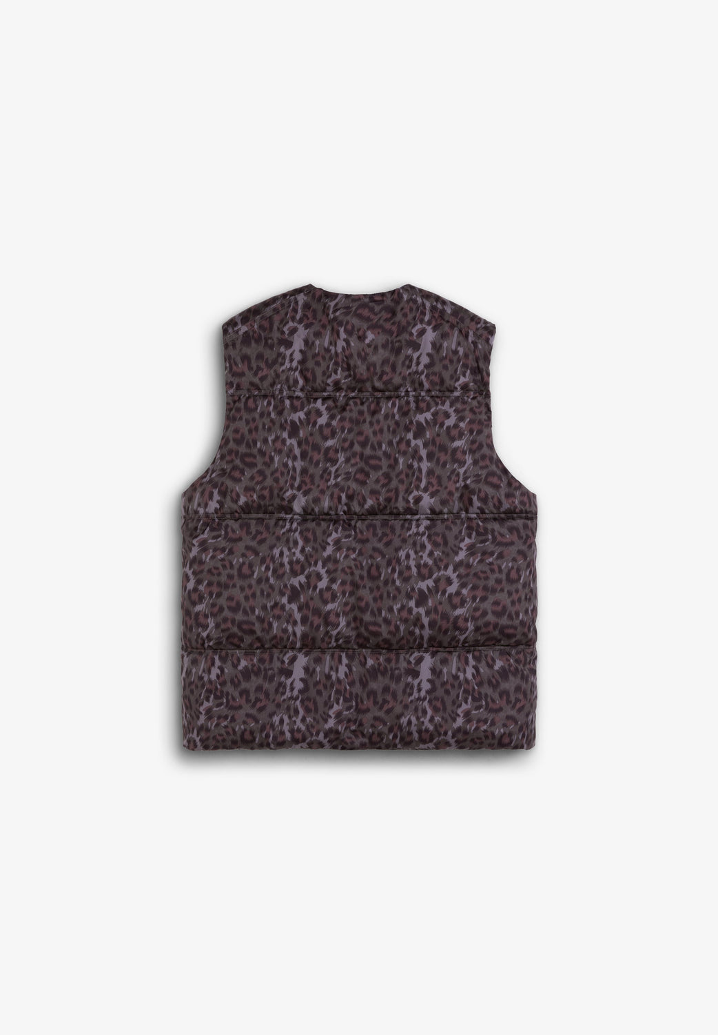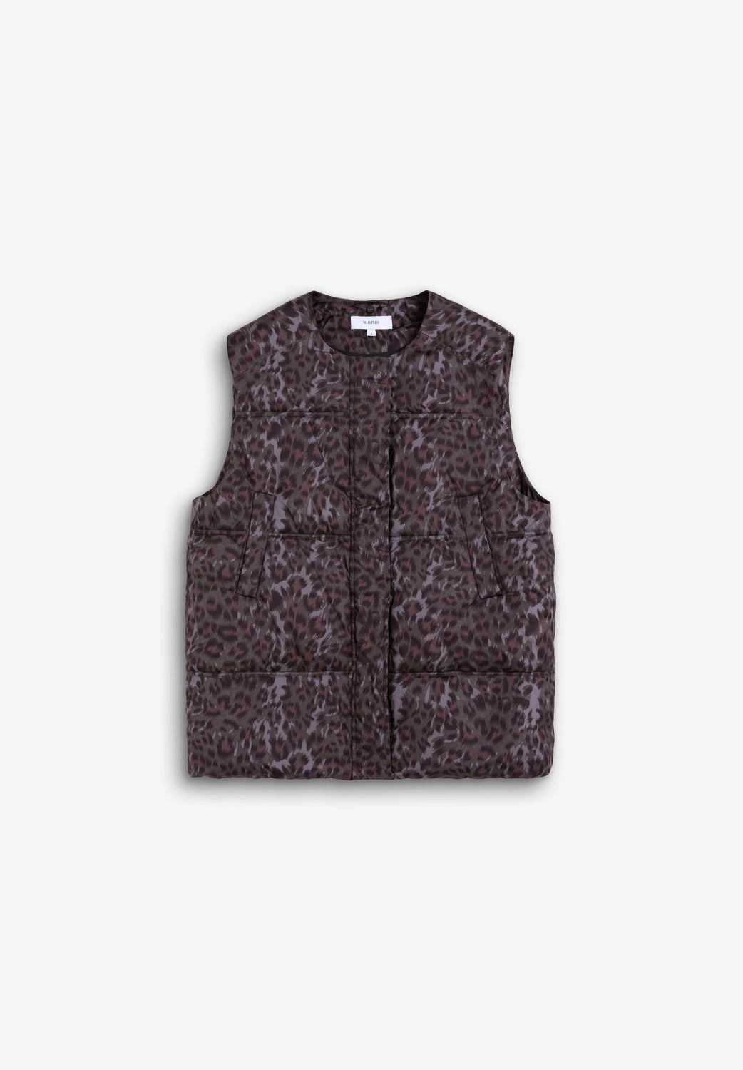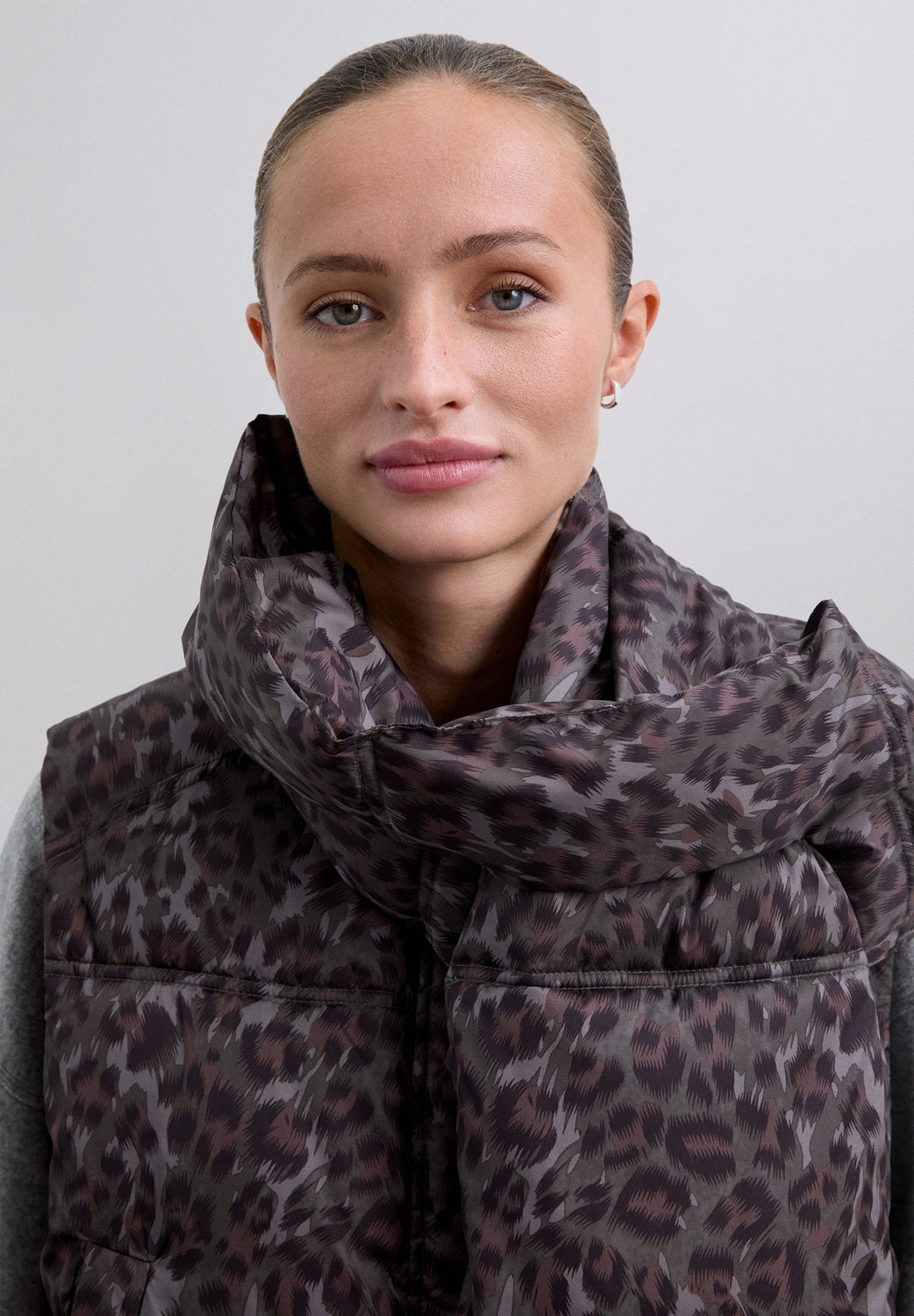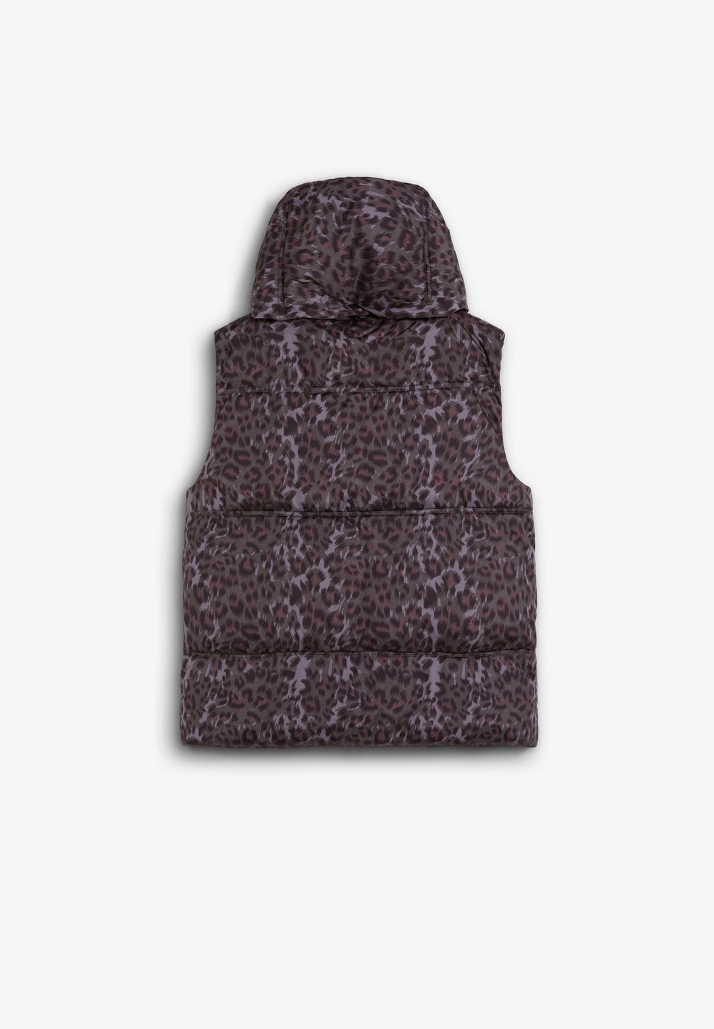 Padded animal print gilet. Concealed zip and press stud fastening. Loose fit. Detachable padded neck scarf. Adjustable drawstring hem. Two front pockets.