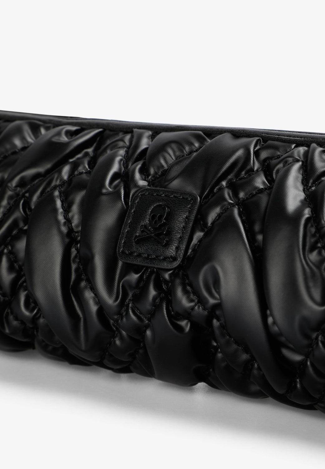 Quilted toiletry bag. Zip fastening. Rubberised front patch detail with metallic skull.
