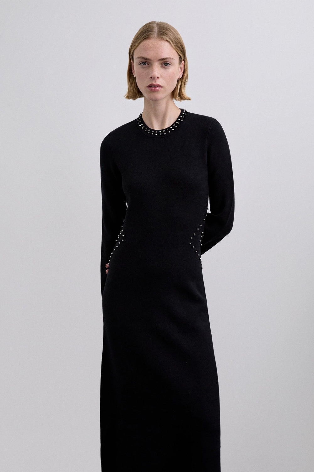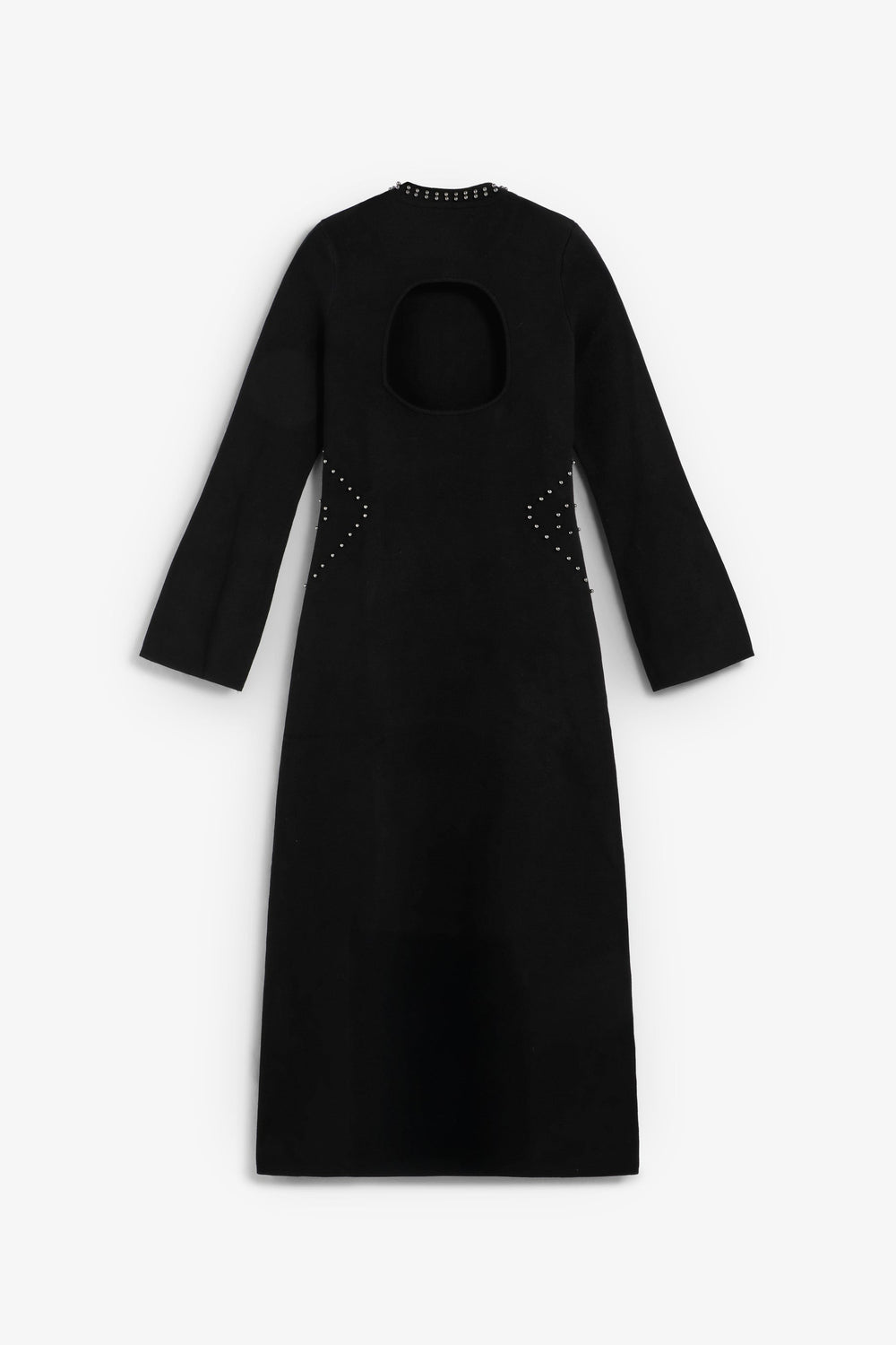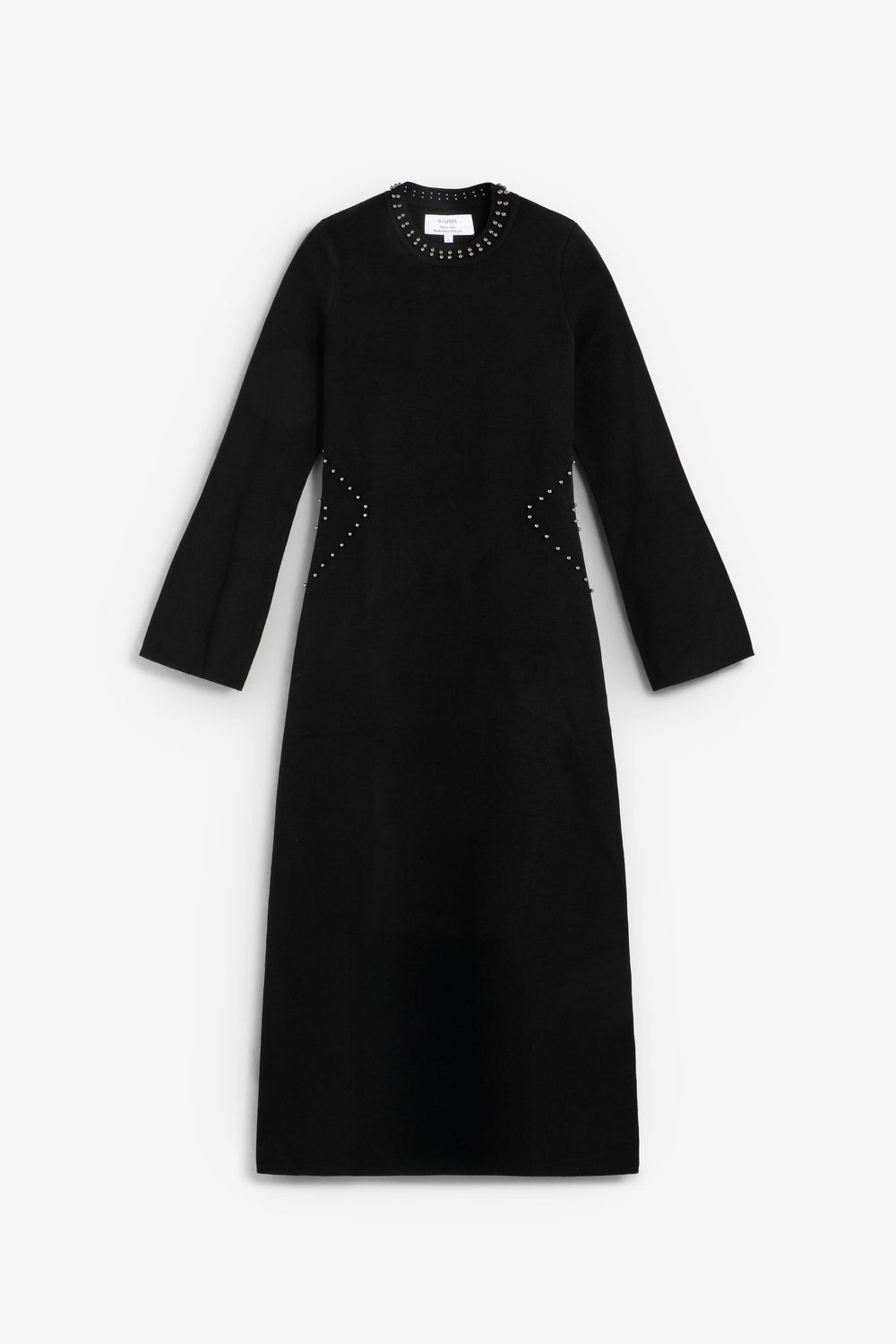 Knitted dress made of a viscoe blend. Slim fit. Round neck. Long flared sleeves. Stud detailing on ncollar eck and waist. Back vent.